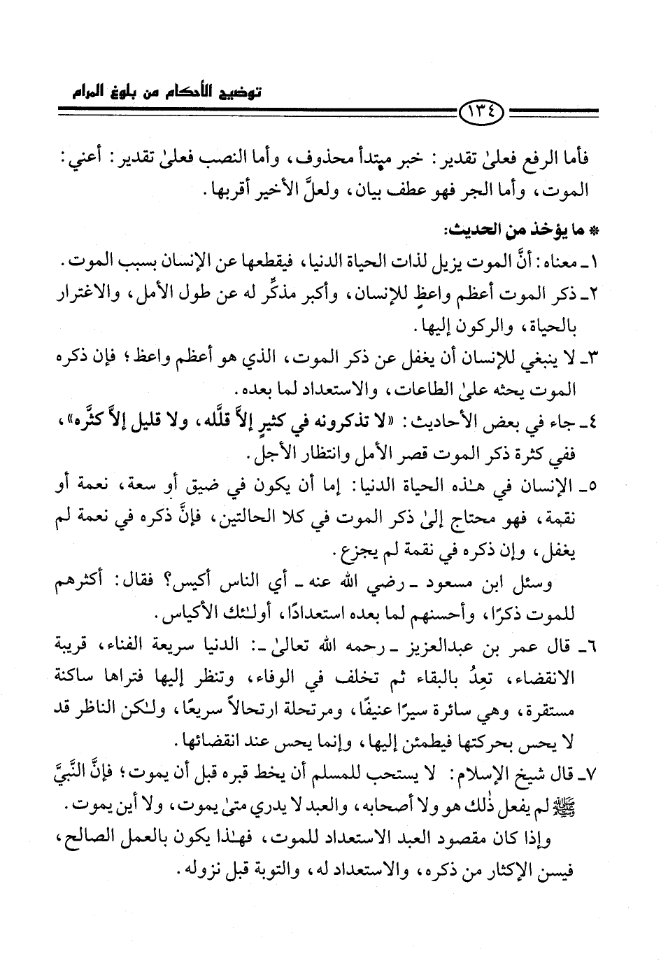5 - الإنسان في هذه الحياة الدنيا: إما أن يكون في ضيق أو سعة، نعمة أو نقمة، فهو محتاج إلى ذكر الموت في كلا الحالتين، فإنَّ ذكره في نعمة لم يغفل، وإن ذكره في نقمة لم يجزع.