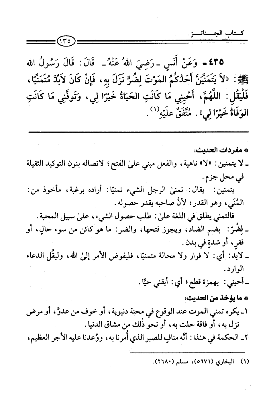 435 - وَعَنْ أَنَسٍ -رَضِيَ اللهُ عَنْهُ- قَالَ: قَالَ رَسُولُ الله -صلى الله عليه وسلم-: "لاَ يَتَمَنَّيَنَّ أَحَدُكُمُ المَوْتَ لِضُرٍّ نَزَلَ بِهِ، فَإنْ كَانَ لاَبُدَّ مُتَمَنِّياً، فَلْيَقُلِ: اللَّهُمَّ، أحْيِنِي مَا كَانَتِ الحَيَاةُ خَيْرًا لِي، وَتَوفَّنِي مَا كَانَتِ الوَفَاةُ خَيْرًا لِي". مُتَّفَقٌ علَيْهِ (¬1).