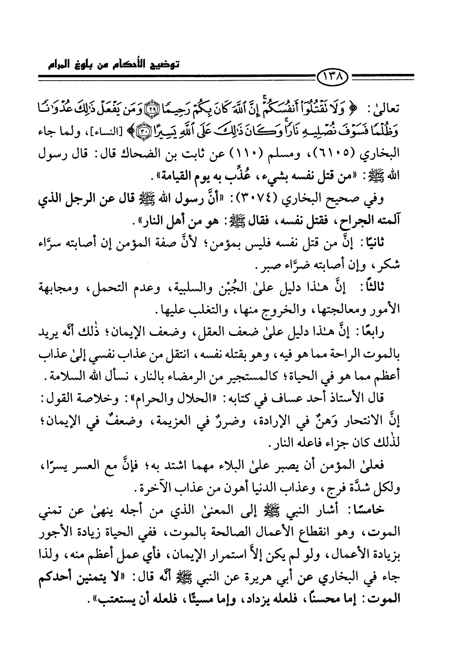 قال الأستاذ أحد عساف في كتابه: "الحلال والحرام": وخلاصة القول: إنَّ الانتحار وَهنٌ في الإرادة، وضررٌ في العزيمة، وضعفٌ في الإيمان؛ لذلك كان جزاء فاعله النار.