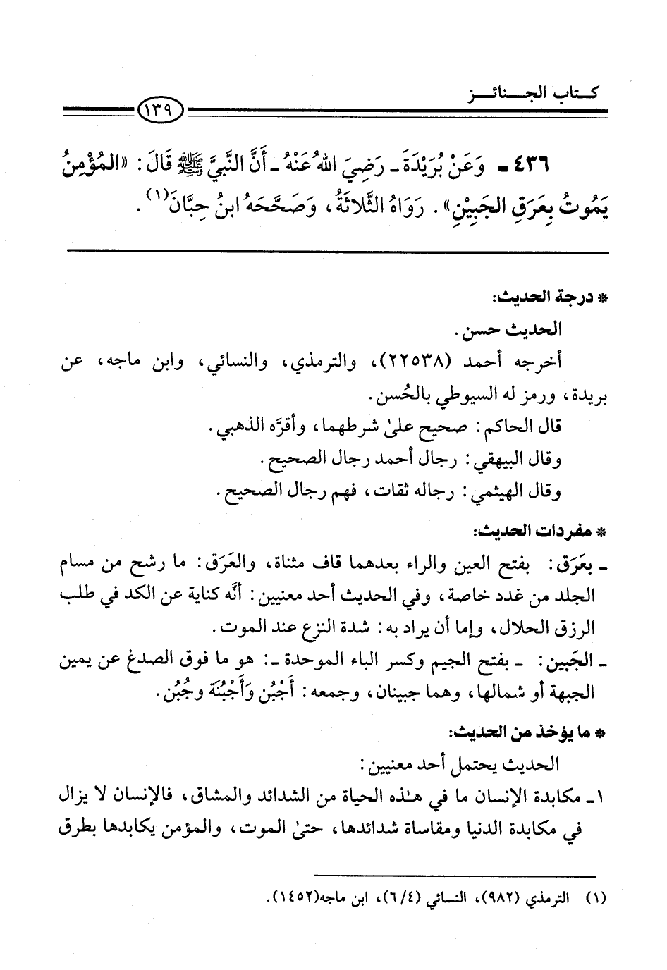 436 - وَعَنْ بُرَيْدَةَ -رَضِيَ اللهُ عَنْهُ- أَنَّ النَّبيَّ -صلى الله عليه وسلم- قَالَ: "المُؤْمِنُ يَمُوتُ بِعَرَقِ الجَبِيْنِ". رَوَاهُ الثَّلاثَةُ، وَصَحَّحَهُ ابنُ حِبَّانَ (¬1).