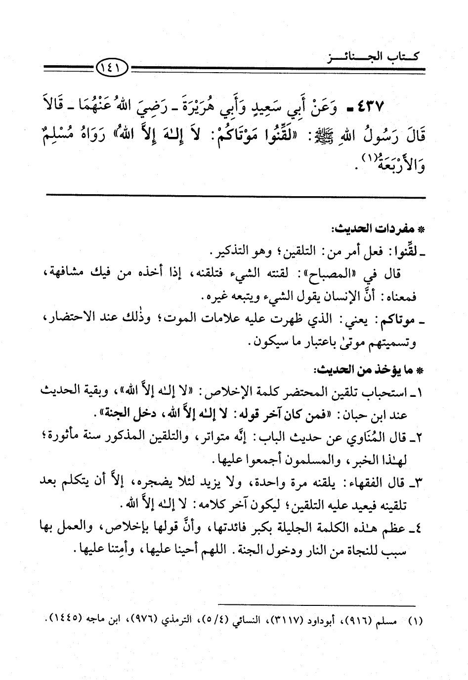437 - وَعَنْ أَبِي سَعِيدٍ وَأَبِي هُرَيْرَةَ -رَضِيَ اللهُ عَنْهُمَا- قَالاَ قَالَ رَسُولُ اللهِ -صلى الله عليه وسلم-: "لَقِّنُوا مَوْتَاكُمْ: لاَ إِلهَ إِلاَّ الله" رَوَاهُ مُسْلِمٌ وَالأَرْبَعَة (¬1).