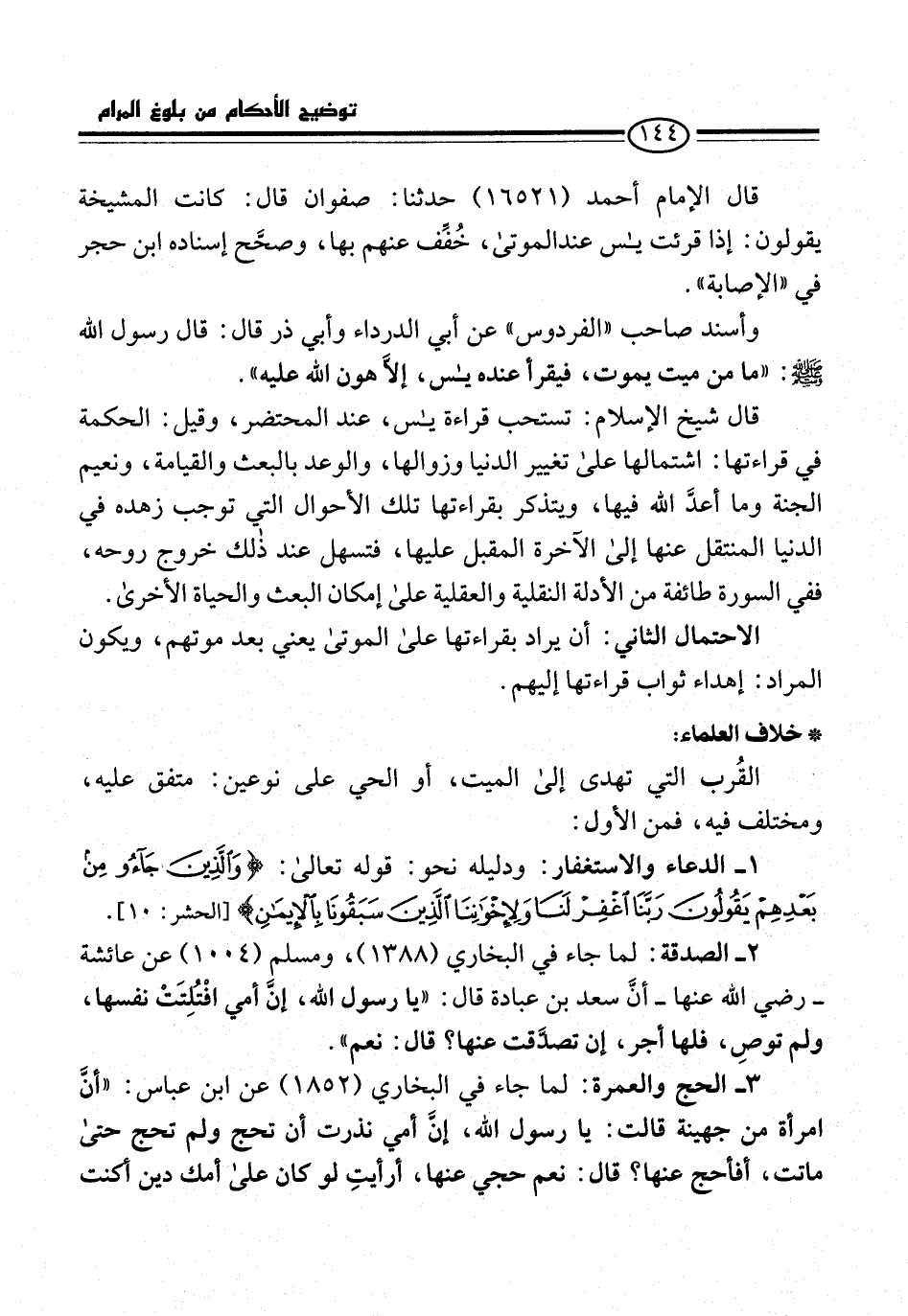 قال الإمام أحمد (16521) حدثنا: صفوان قال: كانت المشيخة يقولون: إذا قرئت يس عند الموتى، خُفِّف عنهم بها، وصحَّح إسناده ابن حجر في "الإصابة".