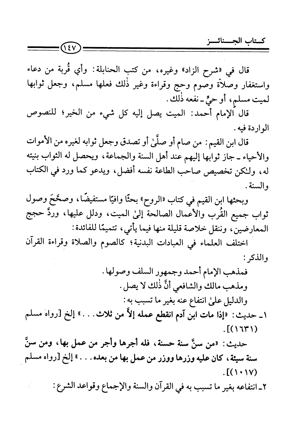 وبحثها ابن القيم في كتاب "الروح" بحثًا وافيًا مستفيضًا، وصحَّحَ وصول ثواب جميع القُرب والأعمال الصالحة إلى الميت، ودلل عليها، وردَّ حجج المعارضين، وننقل خلاصة قليلة منها فيما يأتي، تتميمًا للفائدة: