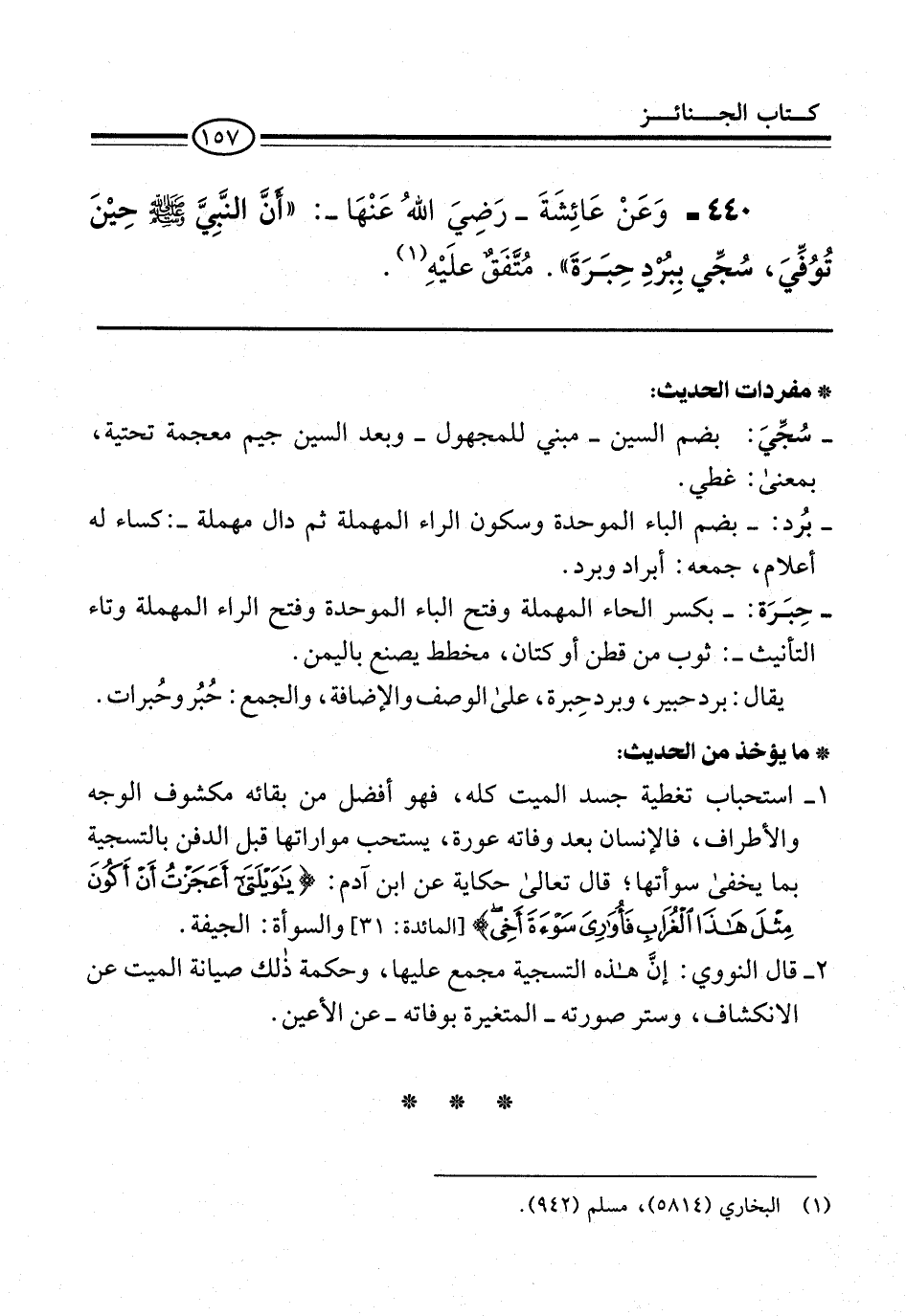 440 - وَعَنْ عَائِشَةَ -رَضِيَ اللهُ عَنْهَا-: "أنَّ النَّبِيَّ -صلى الله عليه وسلم- حِيْنَ تُوُفِّيَ، سُجِّي بِبردِ حِبَرَةَ". مُتَّفَقٌ علَيْهِ (¬1).