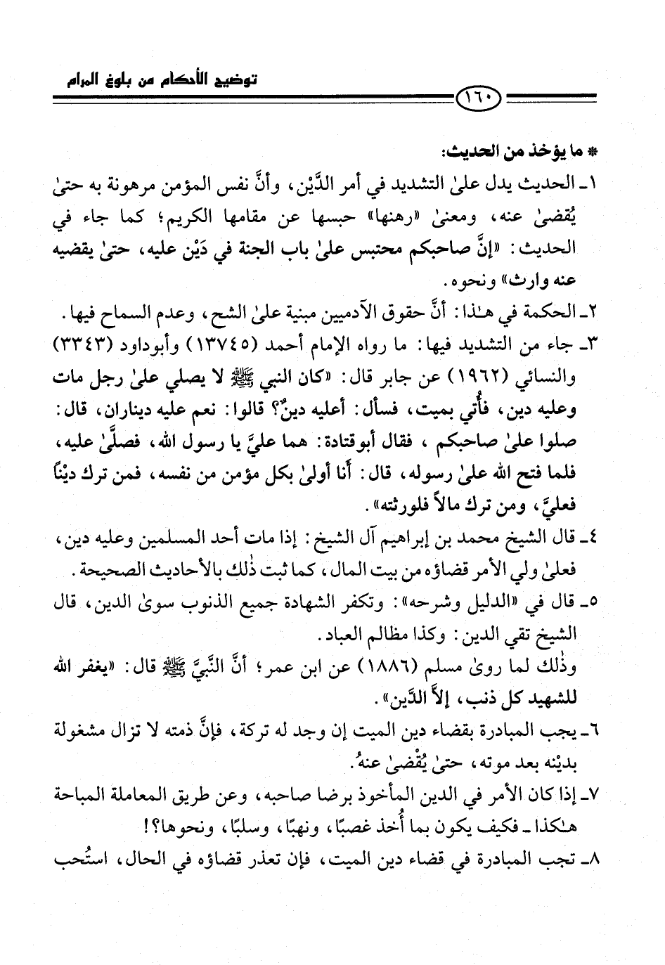 4 - قال الشيخ محمد بن إبراهيم آل الشيخ: إذا مات أحد المسلمين وعليه دين، فعلى ولي الأمر قضاؤه من بيت المال، كما ثبت ذلك بالأحاديث الصحيحة.