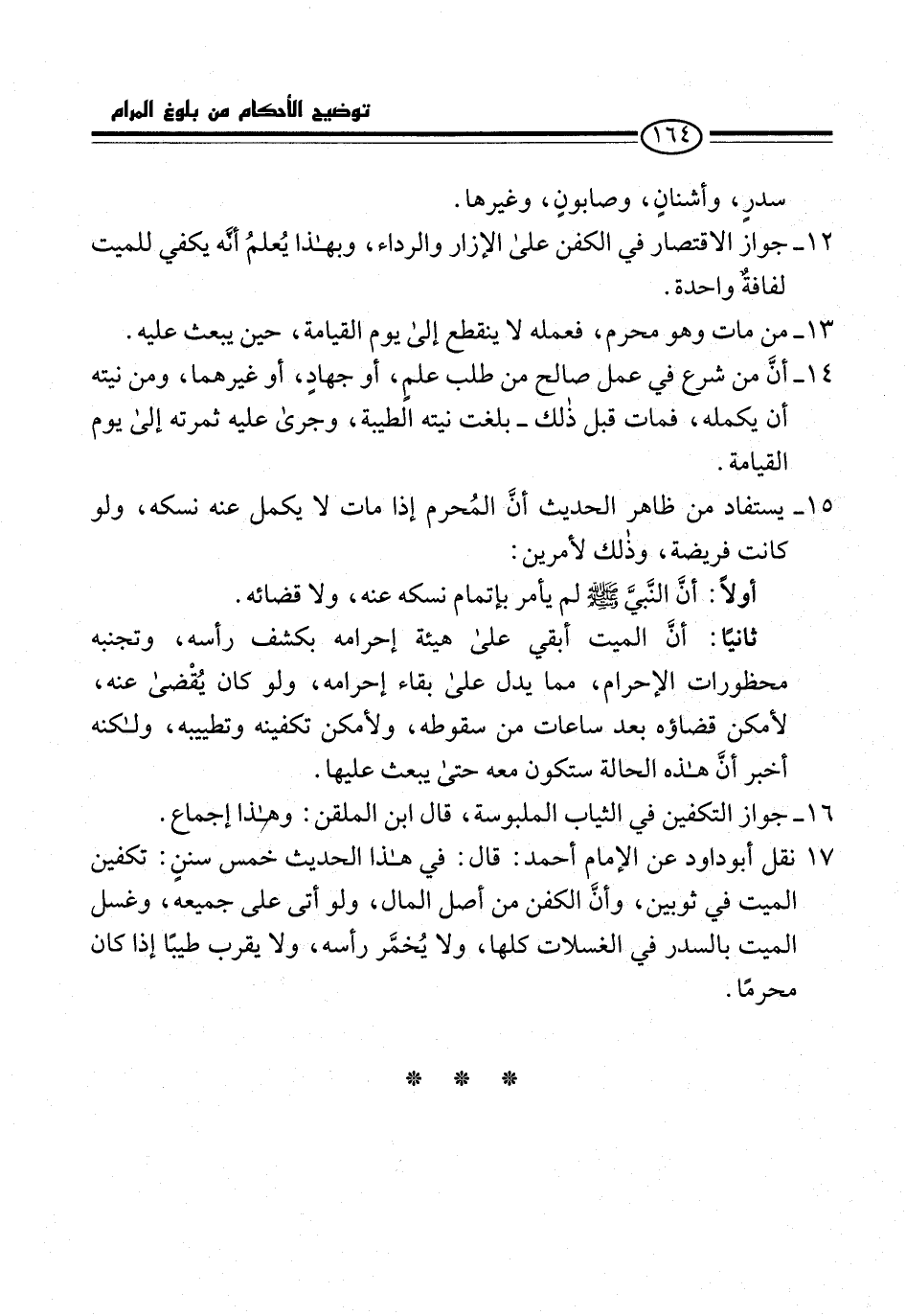 17 - نقل أبو داود عن الإمام أحمد: قال: في هذا الحديث خمس سننٍ: تكفين الميت في ثوبين، وأنَّ الكفن من أصل المال، ولو أتى على جميعه، وغسل الميت بالسدر في الغسلات كلها، ولا يُخمَّر رأسه، ولا يقرب طيباً إذا كان محرماً.