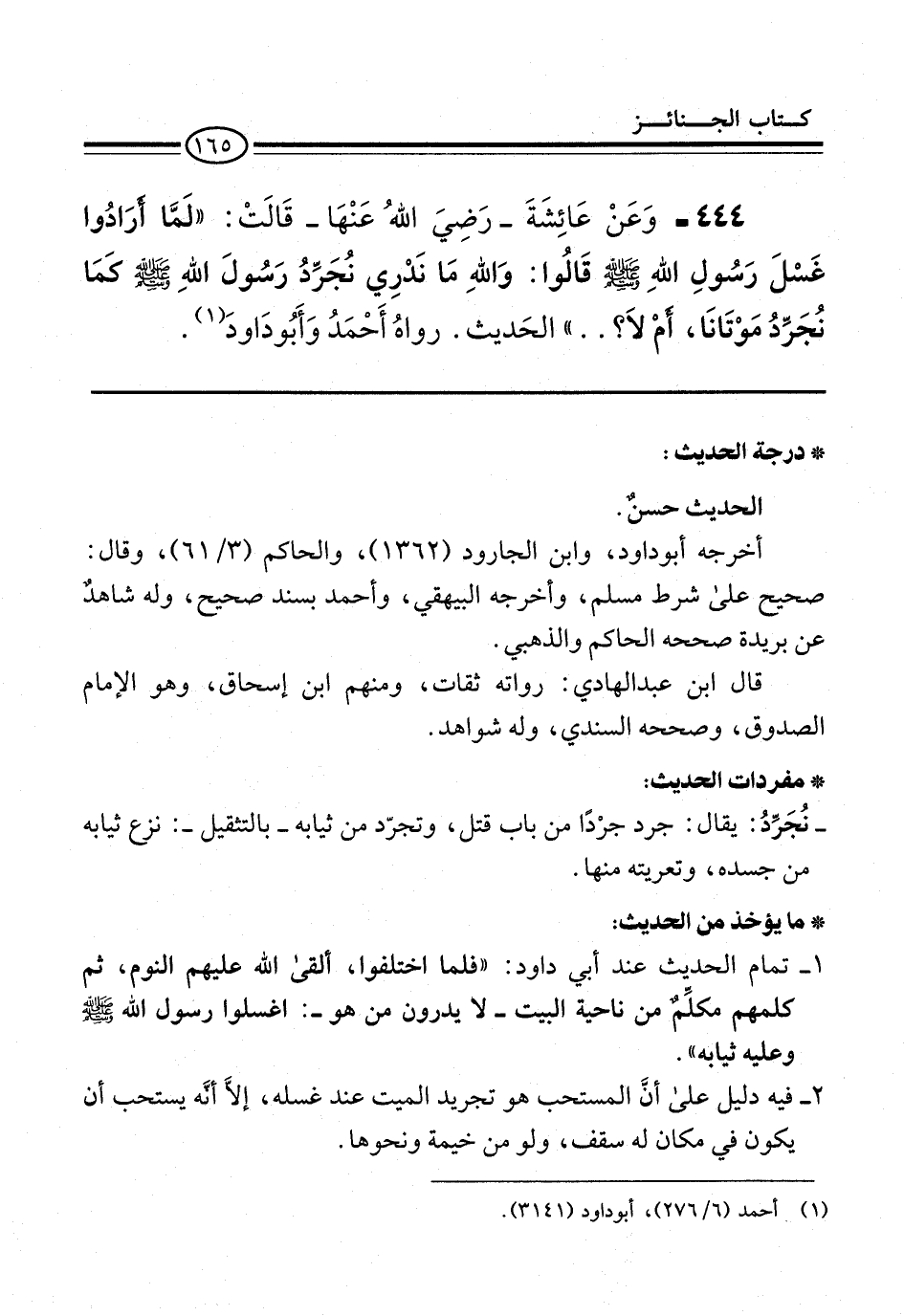444 - وَعَنْ عَائِشَةَ -رَضِيَ اللهُ عَنْهَا- قَالَتْ: "لَمَّا أرَادُوا غَسْلَ رَسُولِ اللهِ -صلى الله عليه وسلم- قَالُوا: وَاللهِ مَا نَدْرِي نُجَرِّدُ رَسُولَ اللهِ -صلى الله عليه وسلم- كمَا نُجَرِّدُ مَوْتَانَا، أمْ لاَ؟ .. " الحَديث. رواهُ أَحْمَدُ وَأَبُو دَاودَ (¬1).