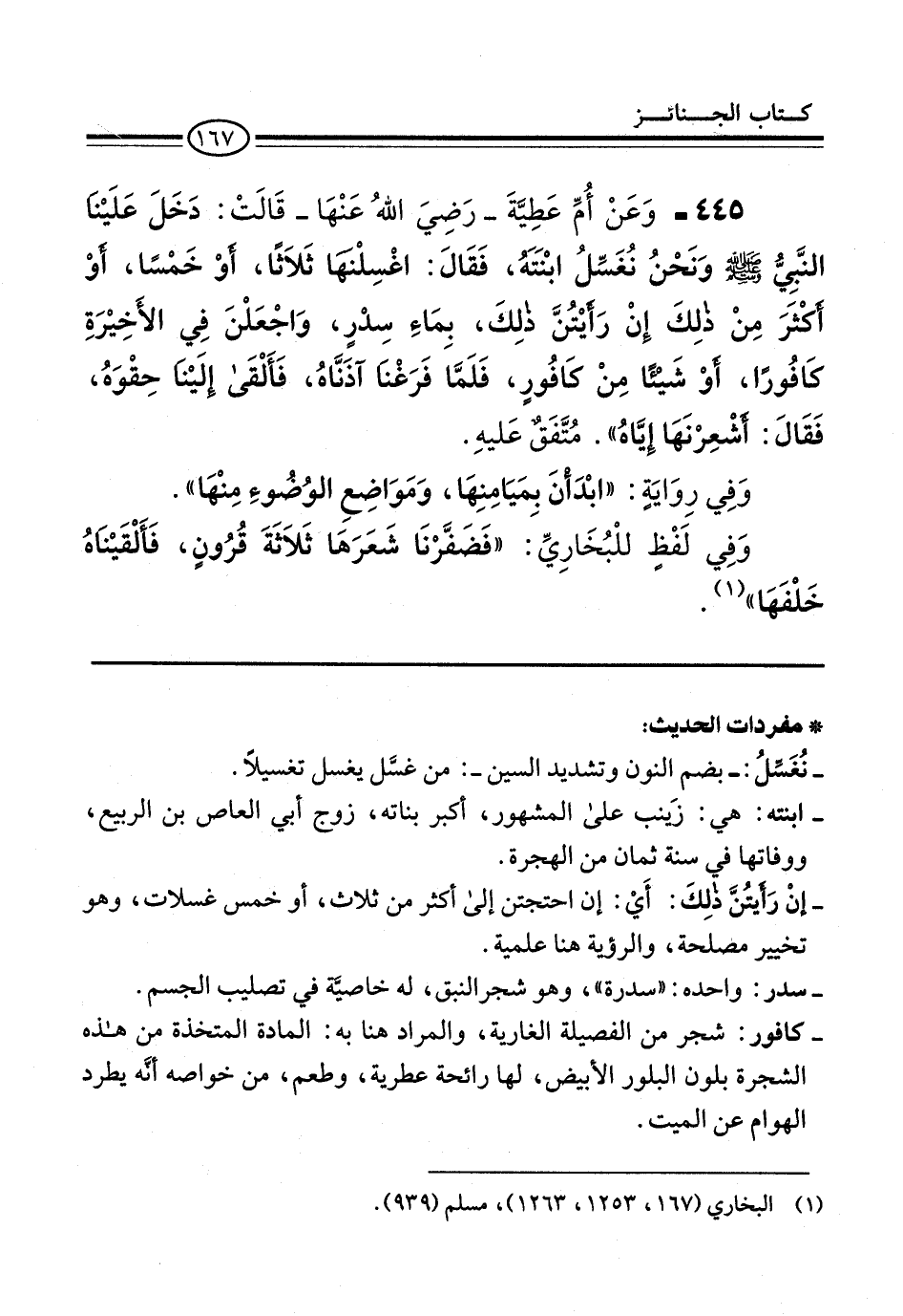 445 - وَعَنْ أُمِّ عَطِيَّةَ -رَضِيَ اللهُ عَنْهَا- قَالَتْ: دَخَلَ عَلَيْنا النَّبِيُّ -صلى الله عليه وسلم- ونَحْنُ نُغَسِّلُ ابْنَتَهُ، فَقَالَ: اغْسِلْنها ثَلاَثًا، أوْ خَمْسًا، أوْ أكْثَرَ مِنْ ذلِكَ إنْ رَأيْتُنَّ ذلِكَ، بِمَاءِ سِدْرٍ، وَاجْعَلْنَ فِي الأَخِيْرَةِ كَافُورًا، أوْ شَيْئاً مِنْ كَافُورٍ، فَلَمَّا فَرَغْنا آذَنَّاهُ، فَأَلْقَى إلَيْنَا حِقْوَهُ، فَقَالَ: أشعِرنَهَا إِيَّاهُ". مُتَّفَقٌ عَليهِ.