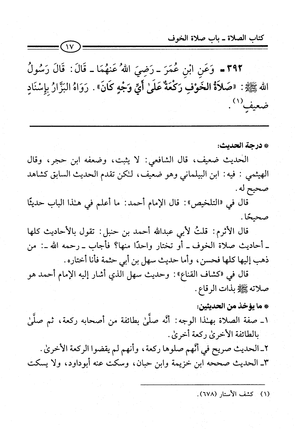 392 - وَعَنِ ابْنِ عُمَرَ -رَضِيَ اللهُ عَنهُمَا- قَالَ: قَالَ رَسُولُ الله -صلى الله عليه وسلم-: "صَلاَةُ الخَوْفِ رَكْعَةٌ عَلَى أَيِّ وَجْهٍ كَانَ". رَوَاهُ البَزَّارُ بِإِسْنَادٍ ضعيفٍ (¬1).