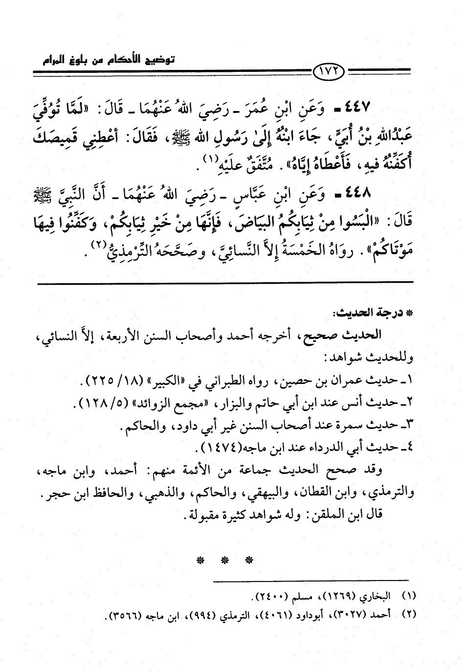 448 - وَعَنِ ابْنِ عَبَّاسٍ -رَضِيَ اللهُ عَنْهُمَا- أَنَّ النَّبِيَّ -صلى الله عليه وسلم- قَالَ: "الْبَسُوا مِنْ ثِيَابِكُمُ البيَاضَ، فَإنَّهَا مِنْ خَيْرِ ثِيَابِكُمْ، وَكَفِّنُوا فِيهَا مَوْتَاكُمْ". روَاهُ الخَمْسَةُ إِلاَّ النَّسائِيَّ، وصَحَّحَهُ التِّرْمِذِيُّ (¬2).