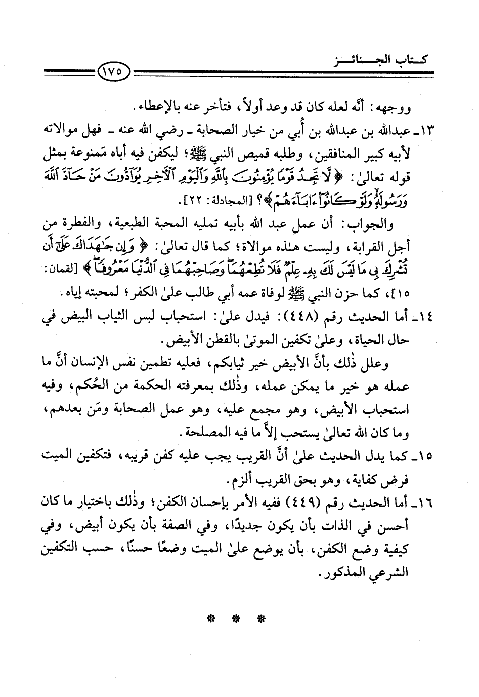 16 - أما الحديث رقم (449) ففيه الأمر بإحسان الكفن؛ وذلك باختيار ما كان أحسن في الذات بأن يكون جديداً، وفي الصفة بأن يكون أبيض، وفي كيفية وضع الكفن، بأن يوضع على الميت وضعاً حسناً، حسب التكفين الشرعي المذكور.