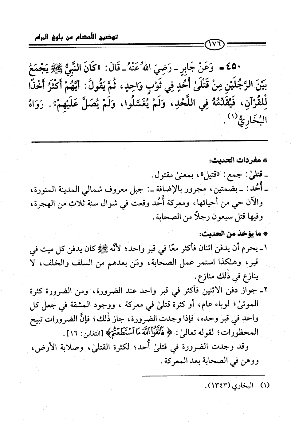 450 - وَعَنْ جَابِرٍ -رَضِيَ اللهُ عَنْهُ- قَالَ: "كَانَ النَّبِيُّ -صلى الله عليه وسلم- يجْمَعُ بَينَ الرَّجُلَيْن مِنْ قَتْلَى أُحُدٍ فِي ثَوْبٍ وَاحِدٍ، ثُمَّ يَقُولُ: أيَّهُمْ أكثَرُ أَخْذًا للقُرْآنِ، فَيقدِّمُهُ فِي اللَّحْدِ، وَلَمْ يُغَسَّلُوا، وَلَمْ يُصَلَّ عَلَيْهِمْ". رَوَاهُ البُخَارِيُّ (¬1).