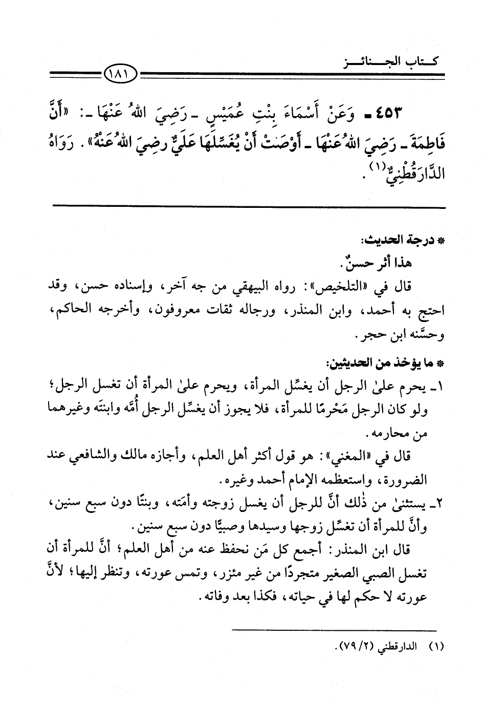 453 - وَعَنْ أَسْمَاءَ بِنْتِ عُمَيْسٍ -رَضِيَ اللهُ عَنْهَا-: "أنَّ فَاطِمَةَ -رَضِيَ اللهُ عَنْهَا- أوْصَتْ أنْ يُغَسِّلَهَا عَلَيٌّ رضِيَ اللهُ عَنْهُ". رَوَاهُ الدَّارَقُطْنِيٌّ (¬1).