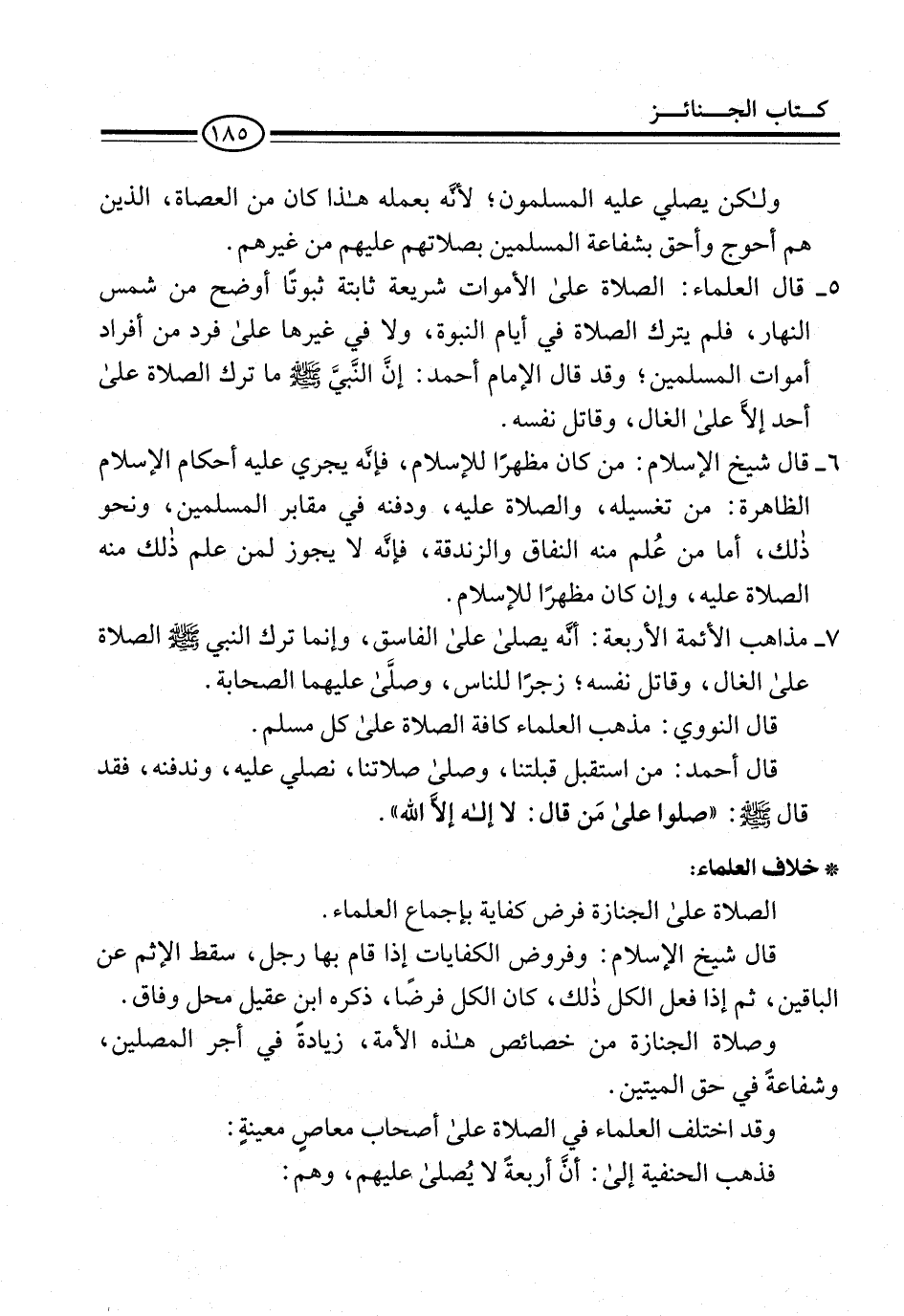 5 - قال العلماء: الصلاة على الأموات شريعة ثابتة ثبوتاً أوضح من شمس النهار، فلم يترك الصلاة في أيام النبوة، ولا في غيرها على فرد من أفراد أموات المسلمين؛ وقد قال الإمام أحمد: إنَّ النَّبيَّ -صلى الله عليه وسلم- ما ترك الصلاة على أحد إلاَّ على الغال، وقاتل نفسه.