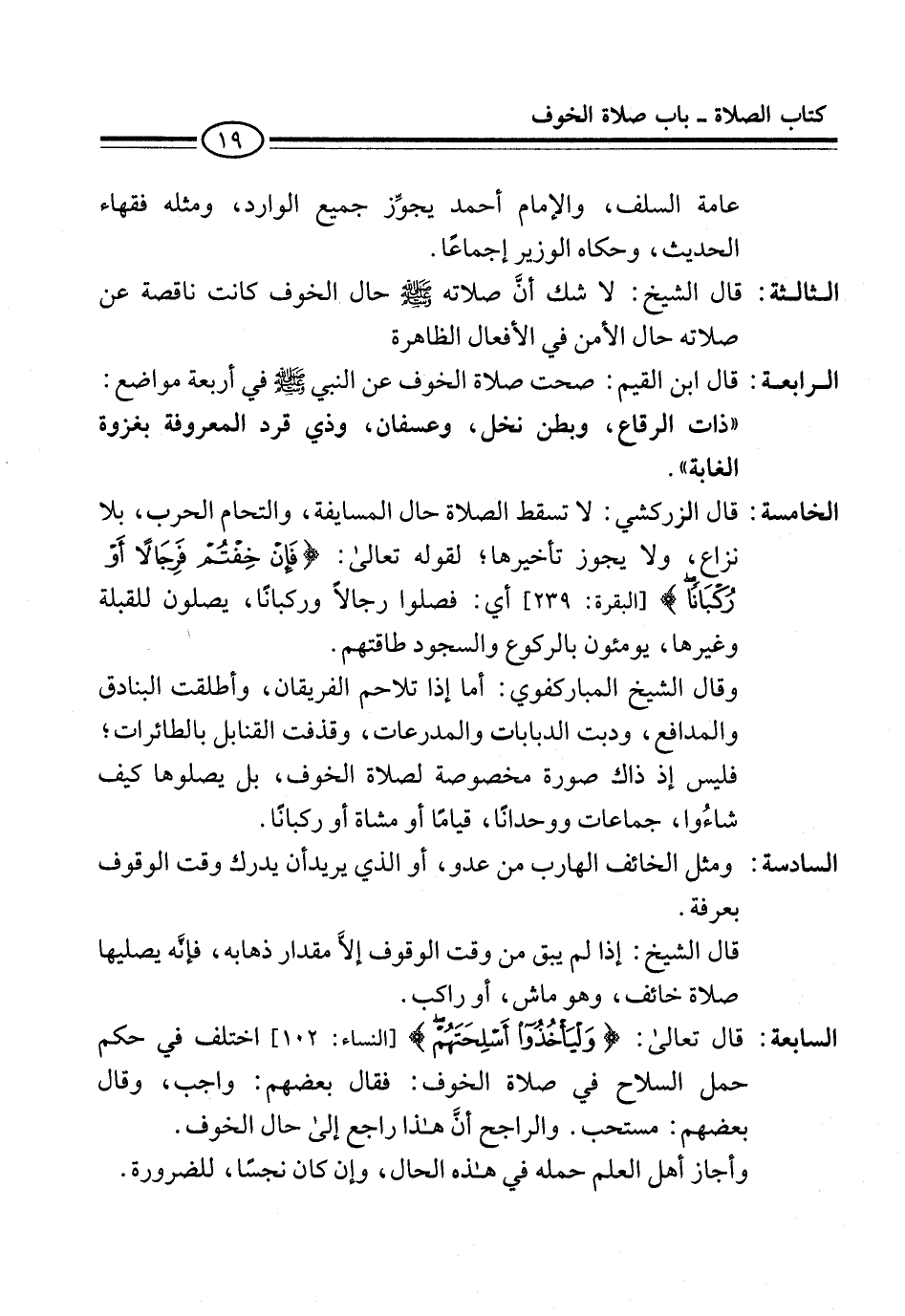الثالثة: قال الشيخ: لا شك أنَّ صلاته -صلى الله عليه وسلم- حال الخوف كانت ناقصة عن صلاته حال الأمن في الأفعال الظاهرة
