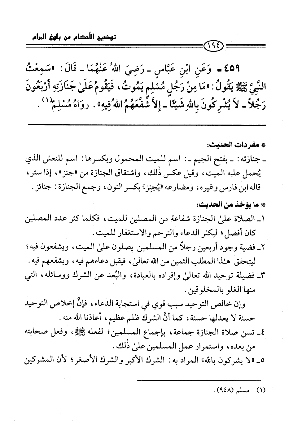 459 - وَعَنِ ابْنِ عَبَّاسٍ -رَضِيَ اللهُ عَنْهُمَا- قَالَ: "سَمِعْتُ النَّبِيَّ -صلى الله عليه وسلم- يَقُولُ: "مَا مِنْ رَجُلٍ مُسْلِمٍ يَمُوتُ، فَتقُومُ عَلَى جَنَازَتهِ أرْبَعُونَ رَجُلاً -لاَ يُشْرِكُونَ بِاللهِ شَيْئاً- إِلاَّ شَفَّعَهُمُ اللهُ فِيهِ". روَاهُ مُسْلِمٌ (¬1).