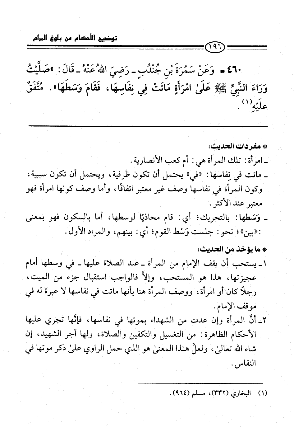 460 - وَعَنْ سَمُرَةَ بْنِ جُنْدُبٍ -رَضِيَ اللهُ عَنْهُ- قَالَ: "صَلَّيْتُ وَرَاءَ النَّبِيِّ -صلى الله عليه وسلم- عَلَى امْرَأةٍ مَاتَتْ فِي نِفَاسِهَا، فَقَامَ وَسَطَهَا". مُتَّفَقٌ علَيْهِ (¬1).