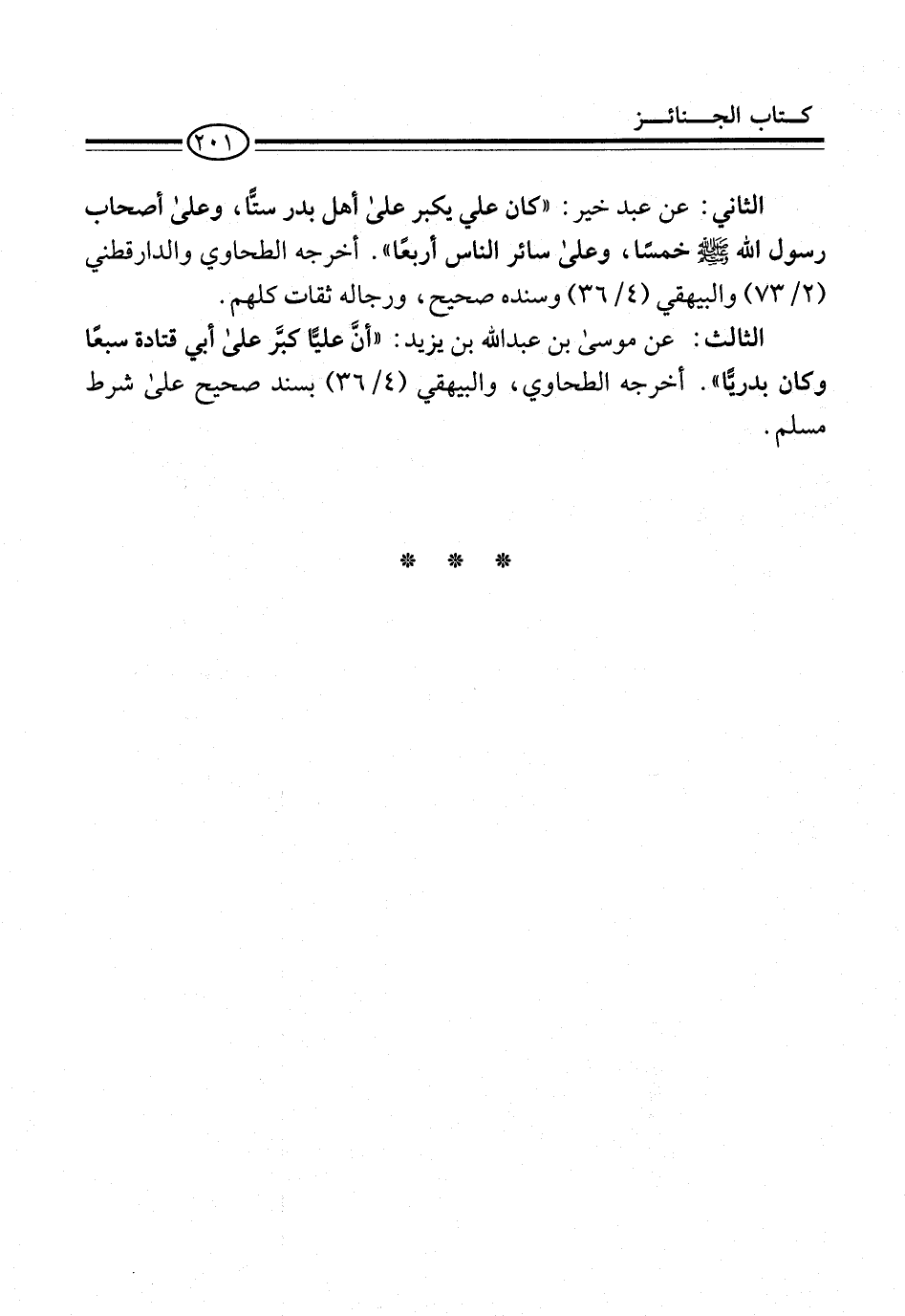 الثاني: عن عبد خير: "كان علي يكبر على أهل بدر ستًّا، وعلى أصحاب رسول الله -صلى الله عليه وسلم- خمساً، وعلى سائر الناس أربعًا". أخرجه الطحاوي والدارقطني (2/ 73) والبيهقي (4/ 36) وسنده صحيح، ورجاله ثقات كلهم.