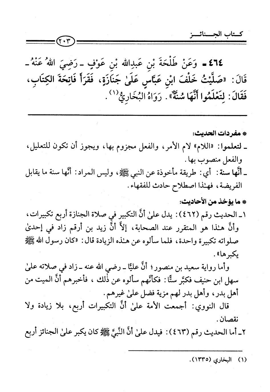 464 - وَعَنْ طَلْحَةَ بْنِ عَبدِ الله بْنِ عَوْفٍ -رَضِيَ اللهُ عَنْهُ- قَالَ: "صَلَّيْتُ خَلْفَ ابْنِ عَبَّاسٍ عَلَى جَنَازَةٍ، فَقَرَأ فَاتِحَةَ الكِتَابِ، فَقَالَ: لِتَعْلَمُوا أنَّهَا سُنَّهٌ". رَوَاهُ البُخَارِيُّ (¬1).