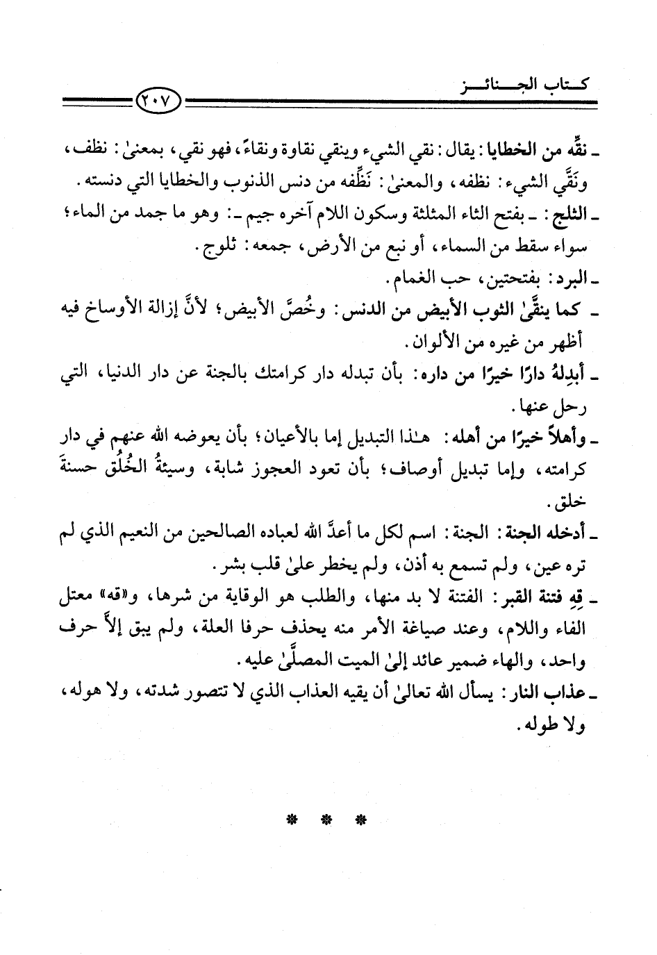 - قِهِ فتنة القبر: الفتنة لابد منها، والطلب هو الوقاية من شرها، و"قه" معتل الفاء واللام، وعند صياغة الأمر منه يحذف حرفا العلة، ولم يبق إلاَّ حرف واحد، والهاء ضمير عائد إلى الميت المصلَّى عليه.