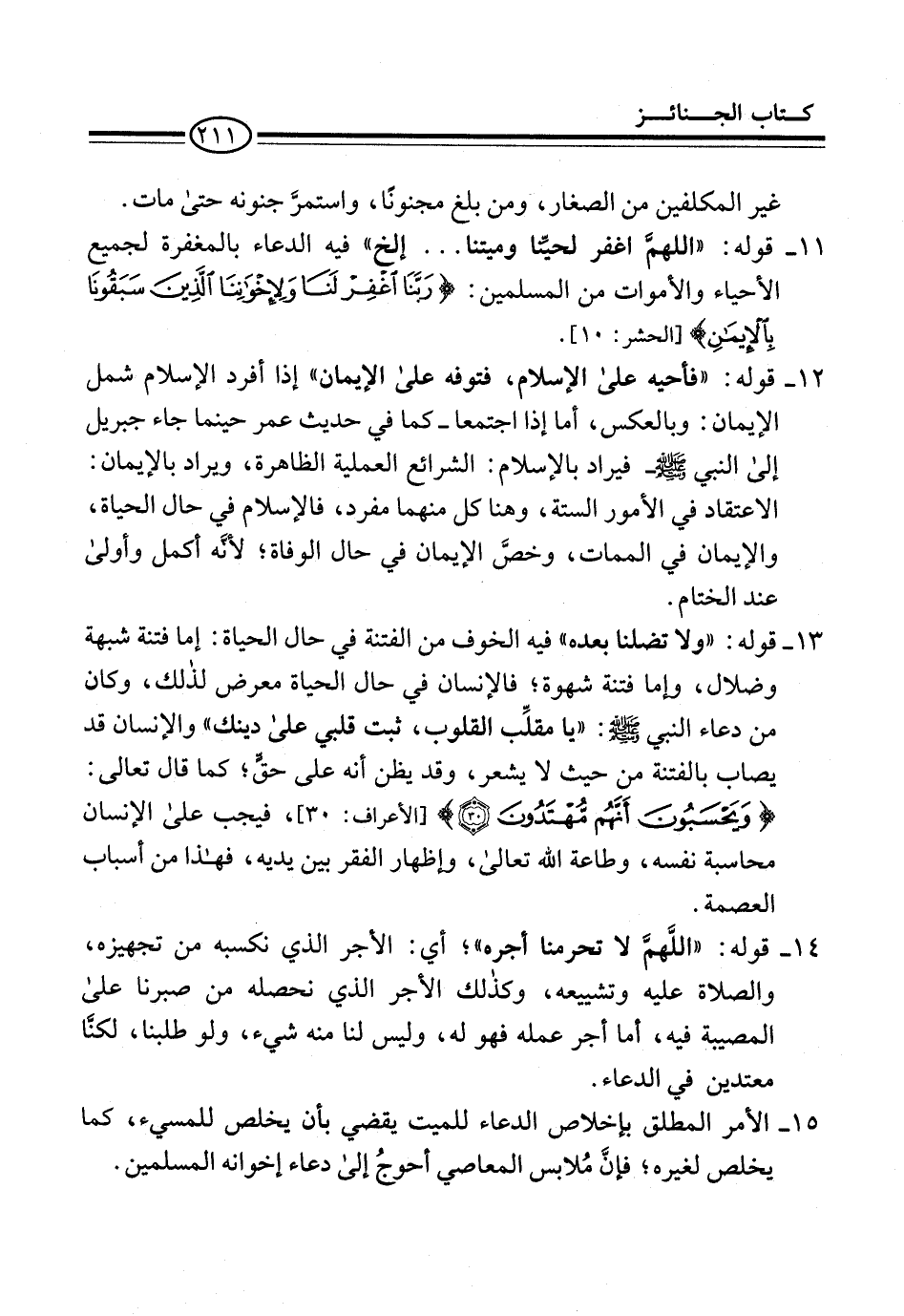 14 - قوله: "اللَّهمَّ لا تحرمنا أجره"؛ أي: الأجر الذي نكسبه من تجهيزه، والصلاة عليه وتشييعه، وكذلك الأجر الذي نحصله من صبرنا على المصيبة فيه، أما أجر عمله فهو له، وليس لنا منه شيء، ولو طلبنا، لكنَّا معتدين في الدعاء.