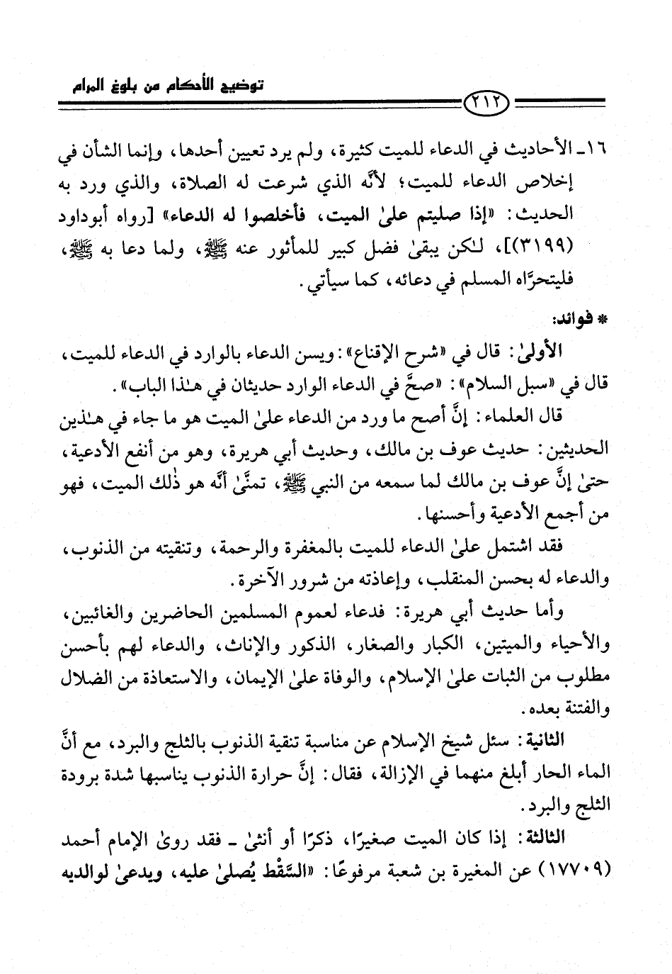الأولى: قال في "شرح الإقناع": ويسن الدعاء بالوارد في الدعاء للميت، قال في "سبل السلام": "صحَّ في الدعاء الوارد حديثان في هذا الباب".