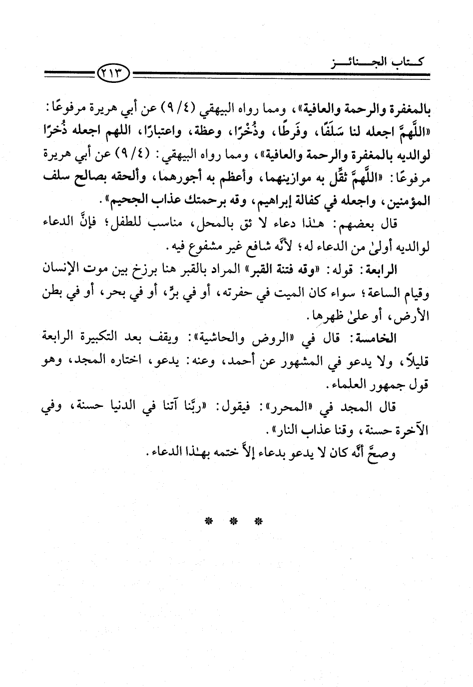 الخامسة: قال في " الروض والحاشية": ويقف بعد التكبيرة الرابعة قليلاً، ولا يدعو في المشهور عن أحمد، وعنه: يدعو، اختاره المجد، وهو قول جمهور العلماء.