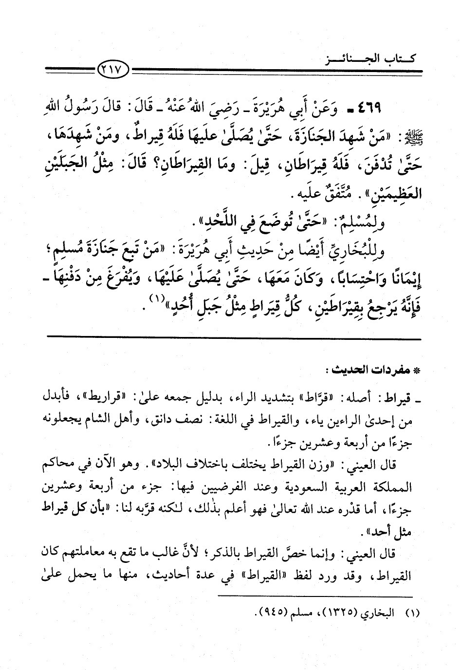 469 - وَعَنْ أِبي هُرَيْرَةَ -رَضِيَ اللهُ عَنْهُ- قَالَ: قالَ رَسُولُ اللهِ -صلى الله عليه وسلم-: "مَنْ شَهِدَ الجَنَازةَ، حَتَّى يُصَلَّى علَيهَا فَلَهُ قِيراطٌ، ومَنْ شَهِدَهَا، حَتَّى تُدْفَنَ، فَلَهُ قِيرَاطَانِ، قِيلَ: ومَا القِيرَاطَانِ؟ قَالَ: مِثْلُ الجَبَلَيْنِ العَظِيمَيْنِ". مُتَّفَقٌ علَيه.