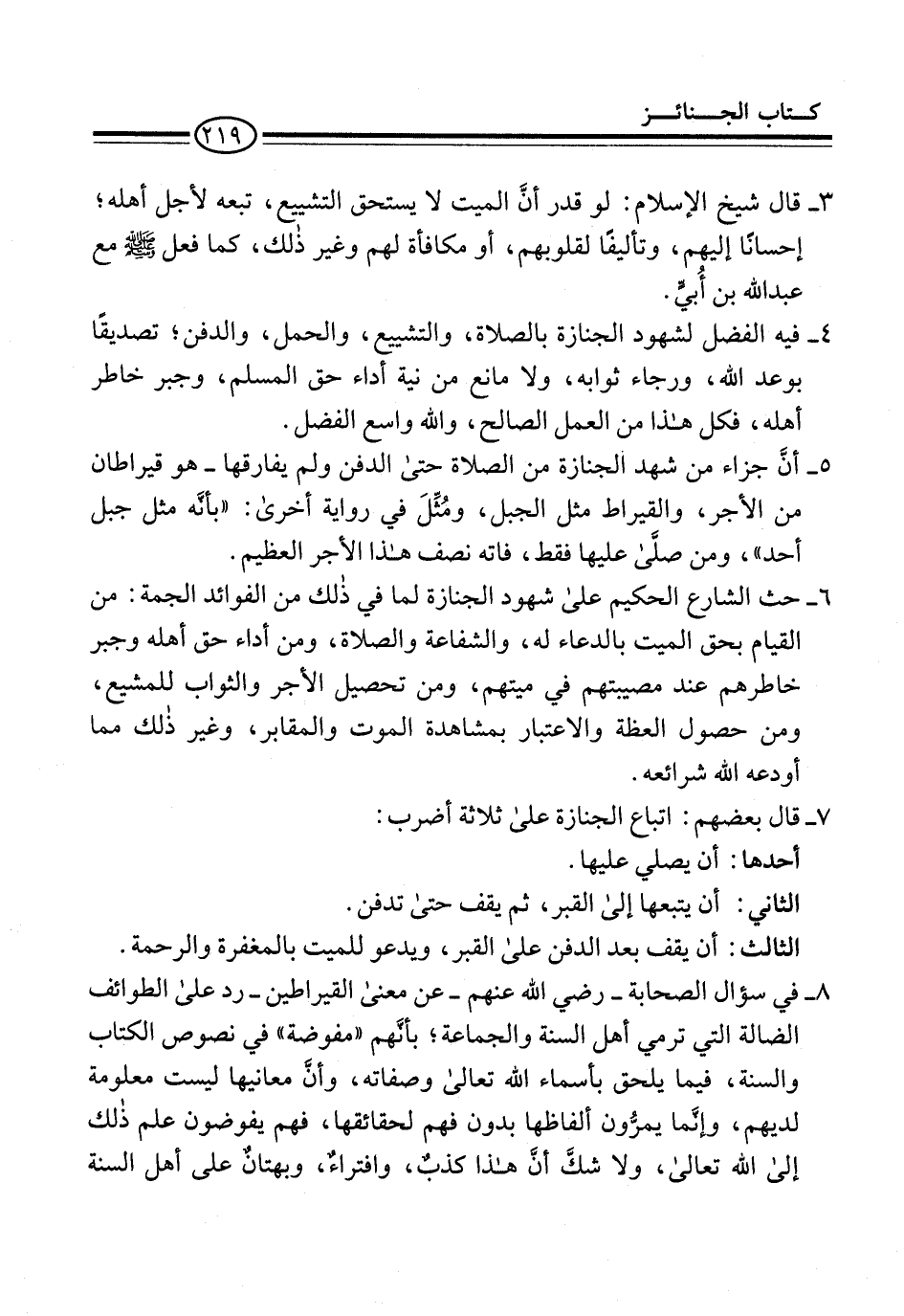 3 - قال شيخ الإسلام: لو قدر أنَّ الميت لا يستحق التشييع، تبعه لأجل أهله؛ إحساناً إليهم، وتأليفاً لقلوبهم، أو مكافأة لهم وغير ذلك، كما فعل -صلى الله عليه وسلم- مع عبد الله بن أُبىٍّ.