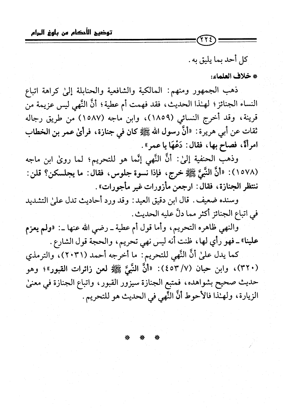 كما يدل على أنَّ النَّهي للتحريم: ما أخرجه أحمد (2031)، والترمذي (320)، وابن حبان (7/ 453): "أنَّ النَّبِيَّ -صلى الله عليه وسلم- لعن زائرات القبور"؛ وهو حديث صحيح بشواهده، فمتبع الجنازة سيزور القبور، واتباع الجنازة في معنى الزيارة، ولهذا فالأحوط أنَّ النَّهي في الحديث هو للتحريم.