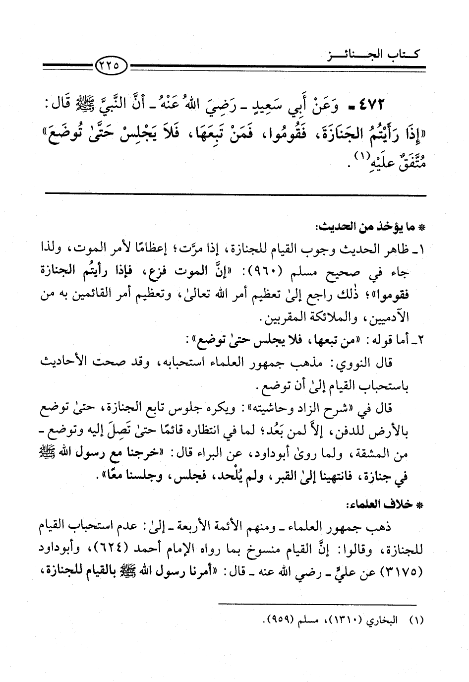 472 - وَعَنْ أِبِي سَعِيدٍ -رَضِيَ اللهُ عَنْهُ- أنَّ النَّبيَّ -صلى الله عليه وسلم- قَال: "إِذَا رَأيْتُمُ الجَنَازَةَ، فقُومُوا، فَمَنْ تَبِعَهَا، فَلاَ يَجْلِسْ حَتَّى تُوضَعَ" مُتَّفَقٌ علَيْهِ (¬1).