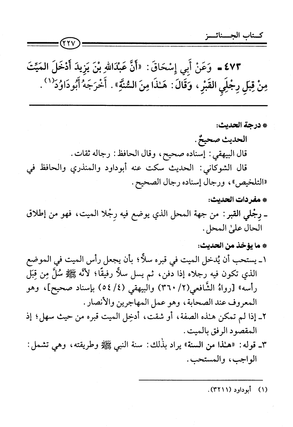 473 - وَعَنْ أَبِي إِسْحَاقَ: "أَنَّ عَبْدَ اللهِ بْنَ يَزِيدَ أدْخَلَ المَيِّتَ مِنْ قِبلِ رِجْلِيِ القَبْرِ، وَقَالَ: هَذَا مِنَ السُّنَّةِ". أَخْرَجَهُ أَبُو دَاوُدَ (¬1).