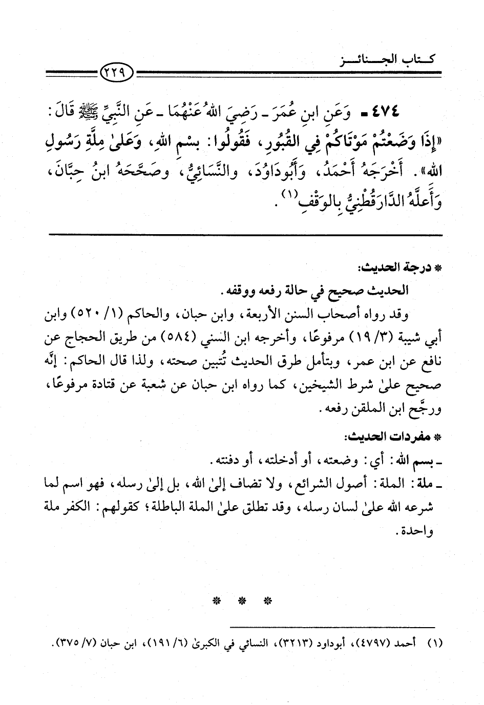 474 - وَعَنِ ابنِ عُمَرَ -رَضِيَ اللهُ عَنْهُمَا- عَنِ النَّبِيِّ -صلى الله عليه وسلم- قَالَ: "إذَا وَضَعْتُمْ مَوْتَاكُمْ فِي القُبُورِ، فَقُولُوا: بسْمِ اللهِ، وَعَلى مِلَّةِ رَسُولِ اللهِ". أَخْرَجَهُ أَحْمَدُ، وَأَبُو دَاوُدَ، والنَّسَائِيُّ، وصَحَّحَهُ ابنُ حِبَّانَ، وَأًعلَّهُ الدَّارَقُطْنِيُّ بِالوَقْفِ (¬1).