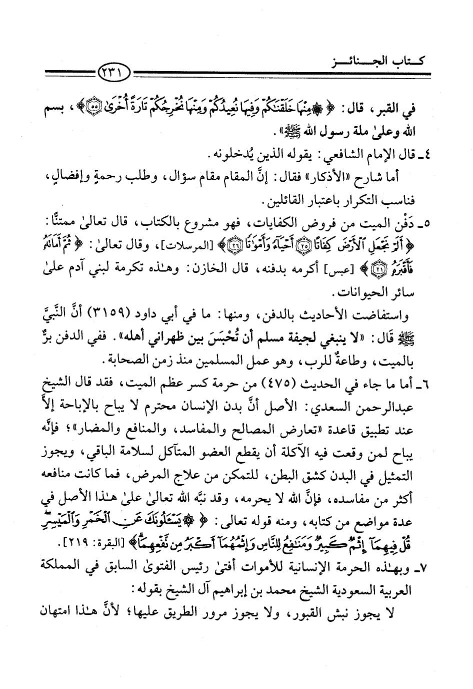 7 - وبهذه الحرمة الإنسانية للأموات أفتى رئيس الفتوى السابق في المملكة العربية السعودية الشيخ محمد بن إبراهيم آل الشيخ بقوله:
