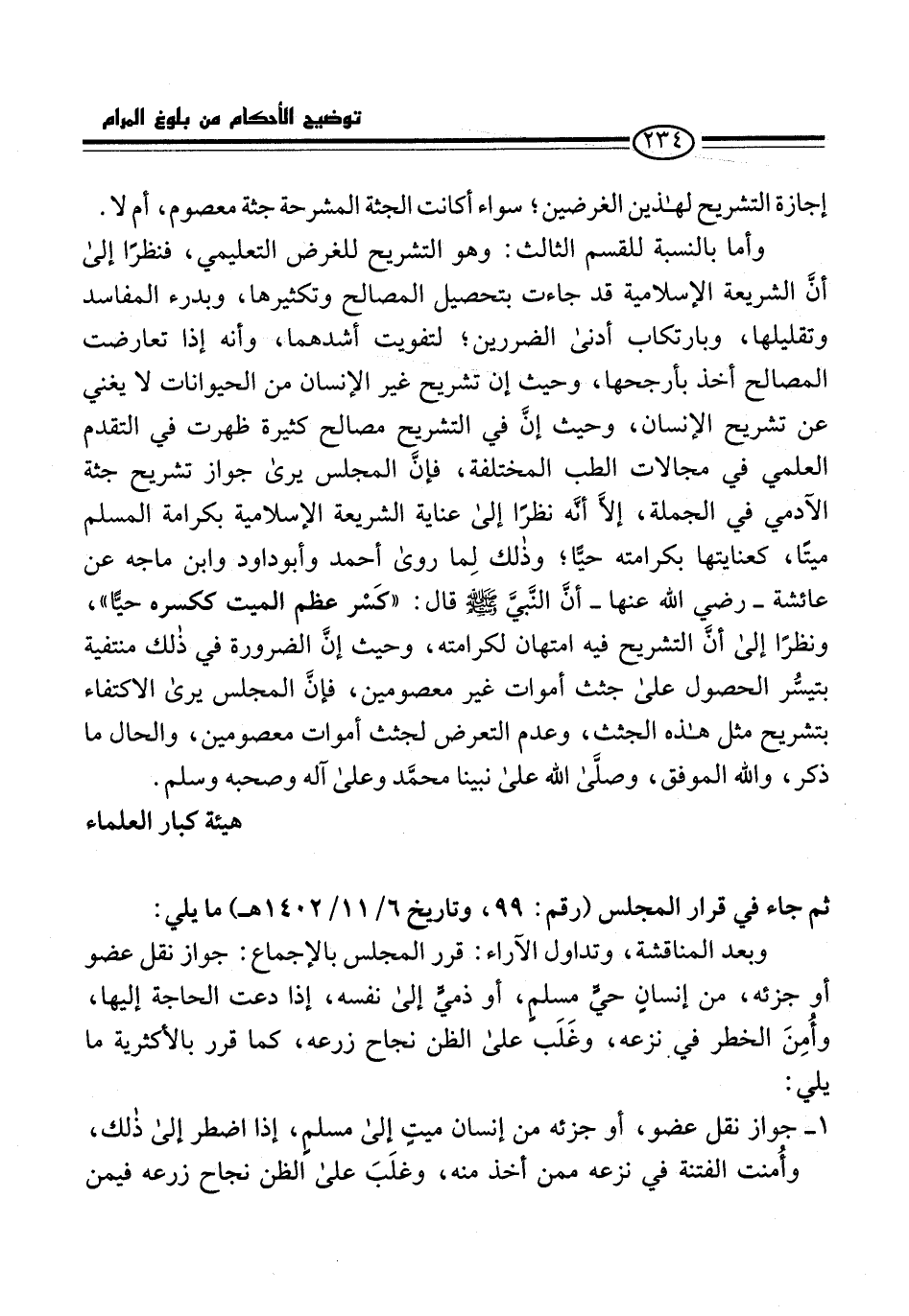 وأما بالنسبة للقسم الثالث: وهو التشريح للغرض التعليمي، فنظراً إلى أنَّ الشريعة الإسلامية قد جاءت بتحصيل المصالح وتكثيرها، وبدرء المفاسد وتقليلها، وبارتكاب أدنى الضررين؛ لتفويت أشدهما، وأنه إذا تعارضت المصالح أخذ بأرجحها، وحيث إن تشريح غير الإنسان من الحيوانات لا يغني عن تشريح الإنسان، وحيث إنَّ في التشريح مصالح كثيرة ظهرت في التقدم العلمي في مجالات الطب المختلفة، فإنَّ المجلس يرى جواز تشريح جثة الآدمي في الجملة، إلاَّ أنَّه نظراً إلى عناية الشريعة الإسلامية بكرامة المسلم ميتاً، كعنايتها بكرامته حيًّا؛ وذلك لِما روى أحمد وأبو داود وابن ماجه عن عائشة -رضي الله عنها- أنَّ النَّبيَّ -صلى الله عليه وسلم- قال: "كَسْر عظم الميت ككسره حيًّا"، ونظراً إلى أنَّ التشريح فيه امتهان لكرامته، وحيث إنَّ الضرورة في ذلك منتفية بتيسُّر الحصول على جثث أموات غير معصومين، فإنَّ المجلس يرى الاكتفاء بتشريح مثل هذه الجثث، وعدم التعرض لجثث أموات معصومين، والحال ما ذكر، والله الموفق، وصلَّى الله على نبينا محمَّد وعلى آله وصحبه وسلم.