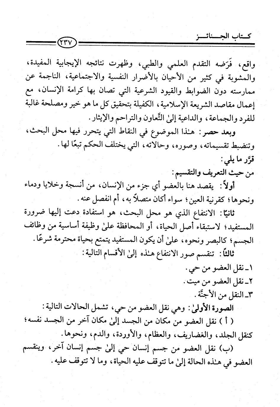 (ب) نقل العضو من جسم إنسان حي إلى جسم إنسان آخر، وينقسم العضو في هذه الحالة إلى ما تتوقف عليه الحياة، وما لا تتوقف عليه.