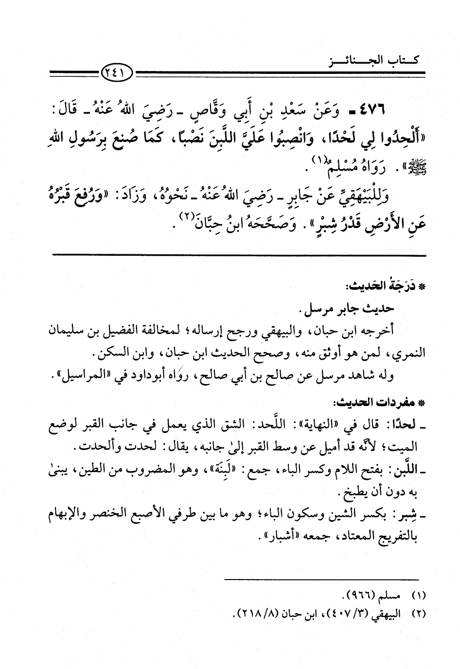 476 - وَعَنْ سَعْدِ بْنِ أَبِي وَقَّاصٍ -رَضِى اللهُ عَنْهُ- قَالَ: "أَلْحِدُوا لِي لَحْدًا، وَانْصِبُوا عَلَيَّ اللَّبِنَ نَصْباً، كمَا صُنعَ بِرَسُولِ اللهِ -صلى الله عليه وسلم-". رَوَاهُ مُسْلِمٌ (¬1).