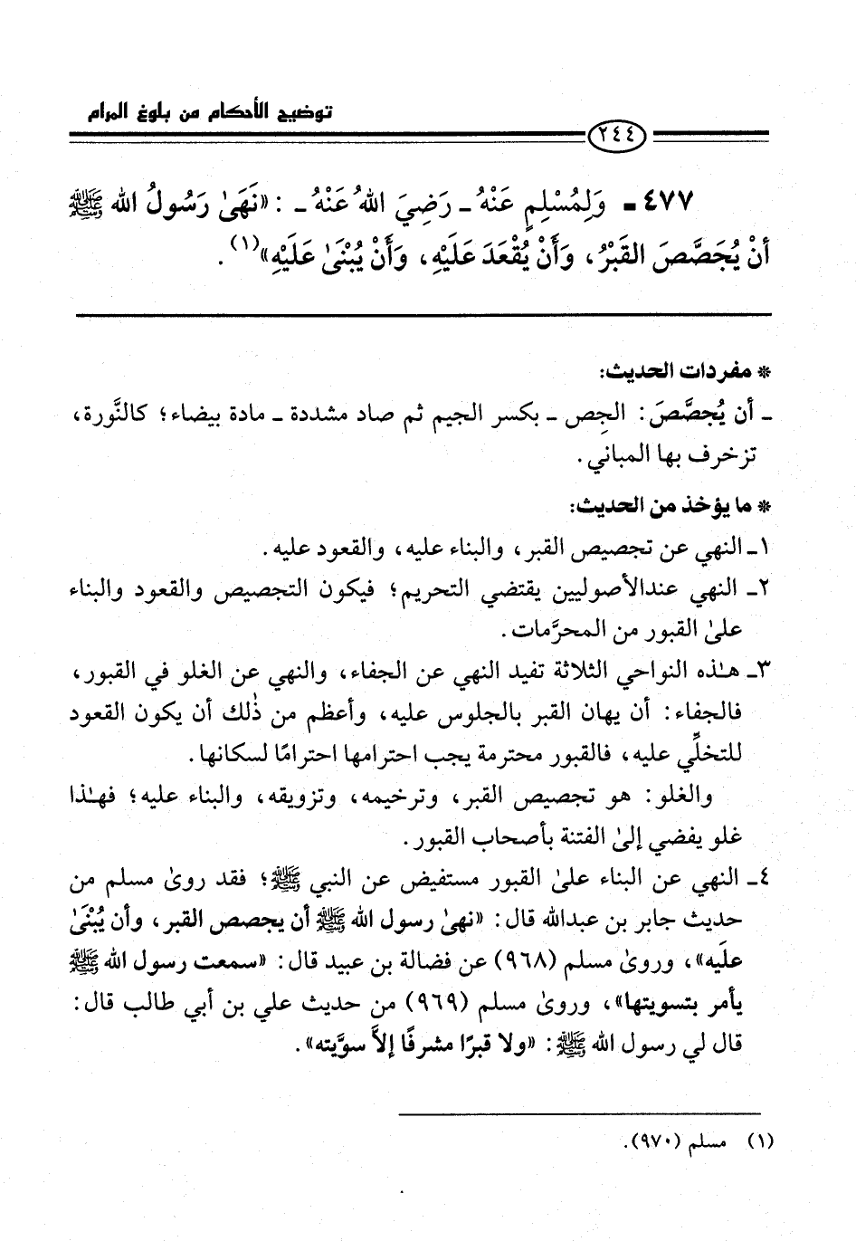 477 - وَلمُسْلِمٍ عَنْهُ -رَضِيَ اللهُ عَنْهُ-: "نَهَى رَسُولُ الله -صلى الله عليه وسلم- أنْ يُجَصَّصَ القَبْرُ، وَأنْ يُقْعَدَ عَلَيْهِ، وَأنْ يُبْنَى عَلَيْهِ" (¬1).