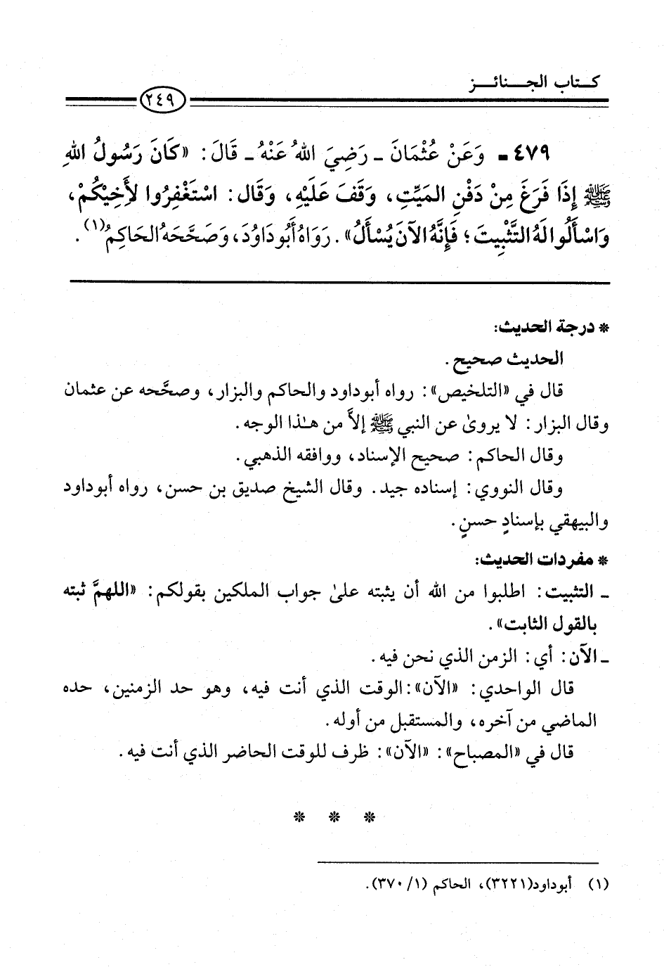 479 - وَعَنْ عُثْمَانَ -رَضِيَ اللهُ عَنْهُ- قَالَ: "كَانَ رَسُولُ اللهِ -صلى الله عليه وسلم- إذَا فَرَغَ مِنْ دَفْنِ المَيِّتِ، وَقَفَ عَلَيْهِ، وَقَال: اسْتَغْفِرُوا لأَخِيْكُمْ، وَاسْألوا لَهُ التَّثْبِيتَ؛ فَإِنَّهُ الآنَ يُسْأَلُ". رَوَاهُ أَبُو دَاوُدَ، وَصَحَّحَهُ الحَاكِمُ (¬1).