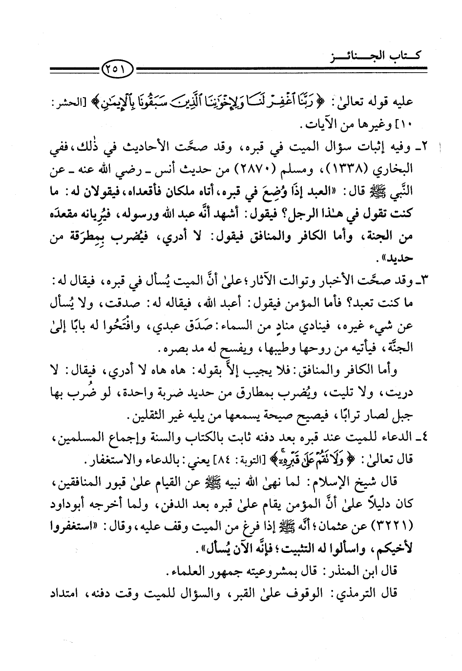 قال شيخ الإسلام: لما نهى الله نبيه -صلى الله عليه وسلم- عن القيام على قبور المنافقين، كان دليلاً على أنَّ المؤمن يقام على قبره بعد الدفن، ولما أخرجه أبو داود (3221) عن عثمان؛ أنَّه -صلى الله عليه وسلم- إذا فرغ من الميت وقف عليه، وقال: "استغفروا لأخيكم، واسألوا له التثبيت؛ فإنَّه الآن يُسأل".