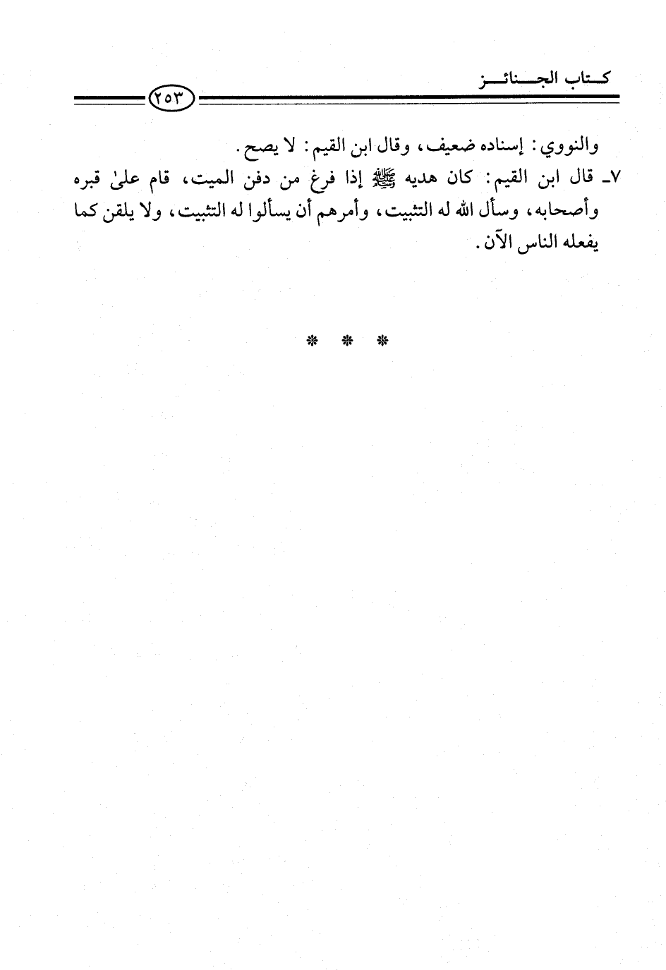 7 - قال ابن القيم: كان هديه -صلى الله عليه وسلم- إذا فرغ من دفن الميت، قام على قبره وأصحابه، وسأل الله له التثبيت، وأمرهم أن يسألوا له التثبيت، ولا يلقن كما يفعله الناس الآن.