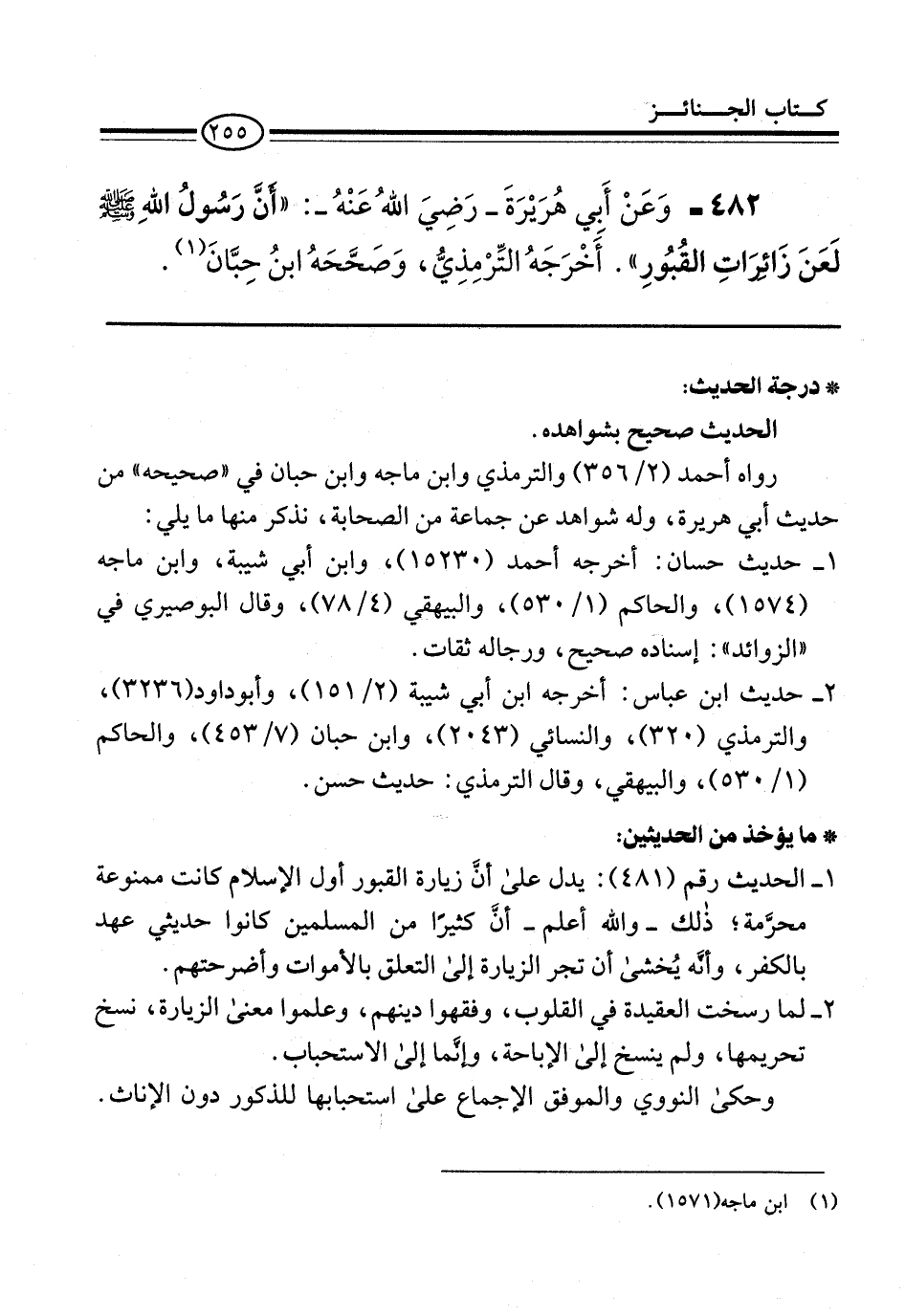 1 - الحديث رقم (481): يدل على أنَّ زيارة القبور أول الإسلام كانت ممنوعة محرَّمة؛ ذلك -والله أعلم- أنَّ كثيرًا من المسلمين كانوا حديثي عهد بالكفر، وأنَّه يُخشى أن تجر الزيارة إلى التعلق بالأموات وأضرحتهم.