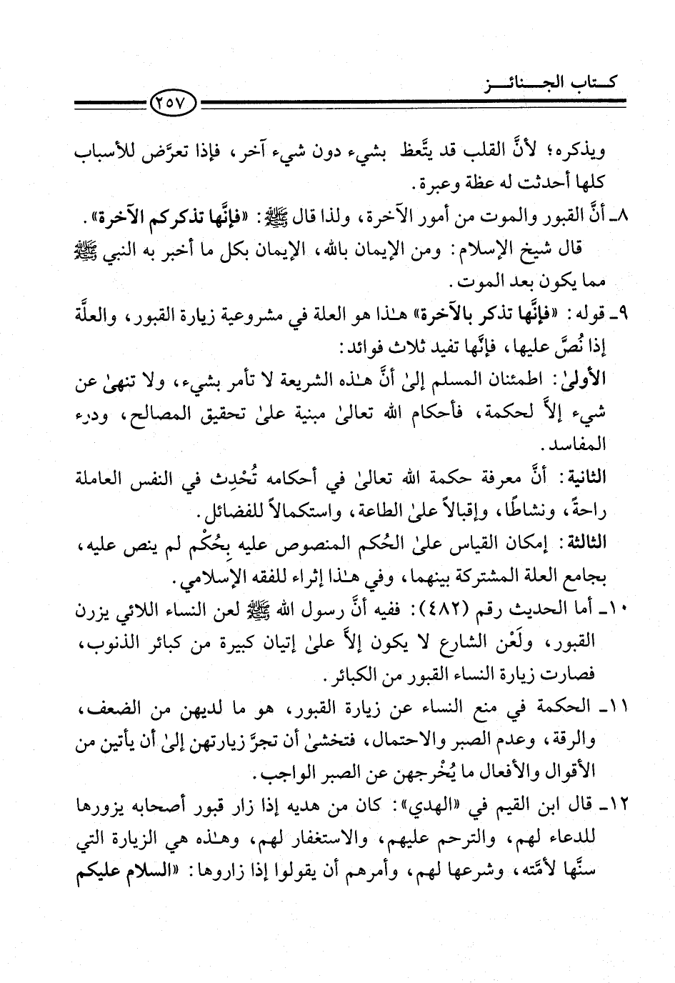 9 - قوله: "فإنَّها تذكر بالآخرة" هذا هو العلة فى مشروعية زيارة القبور، والعلَّة إذا نُصَّ عليها، فإنَّها تفيد ثلاث فوائد: