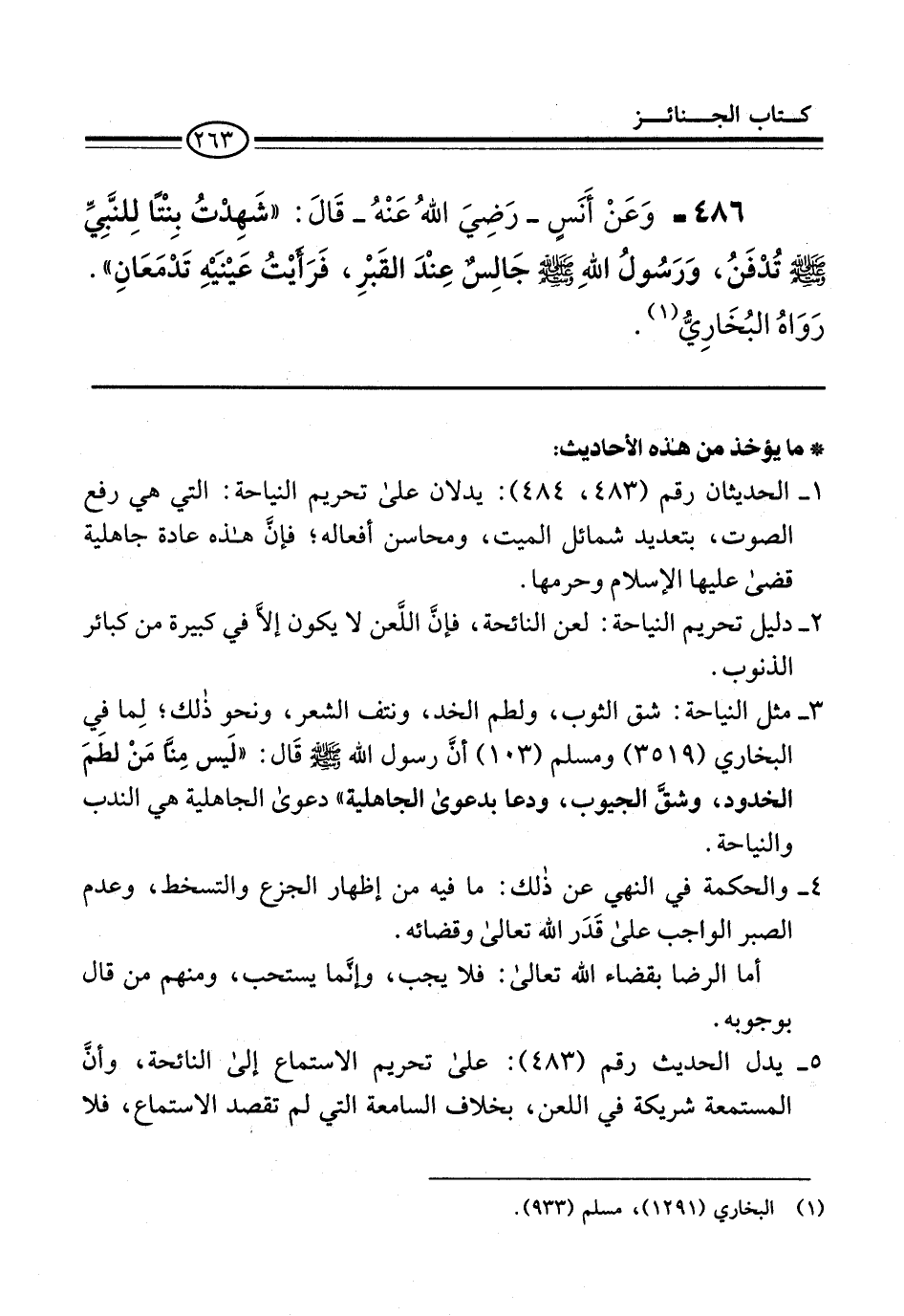 1 - الحديثان رقم (483، 484): يدلان على تحريم النياحة: التي هي رفع الصوت، بتعديد شمائل الميت، ومحاسن أفعاله؛ فإنَّ هذه عادة جاهلية قضى عليها الإسلام وحرمها.