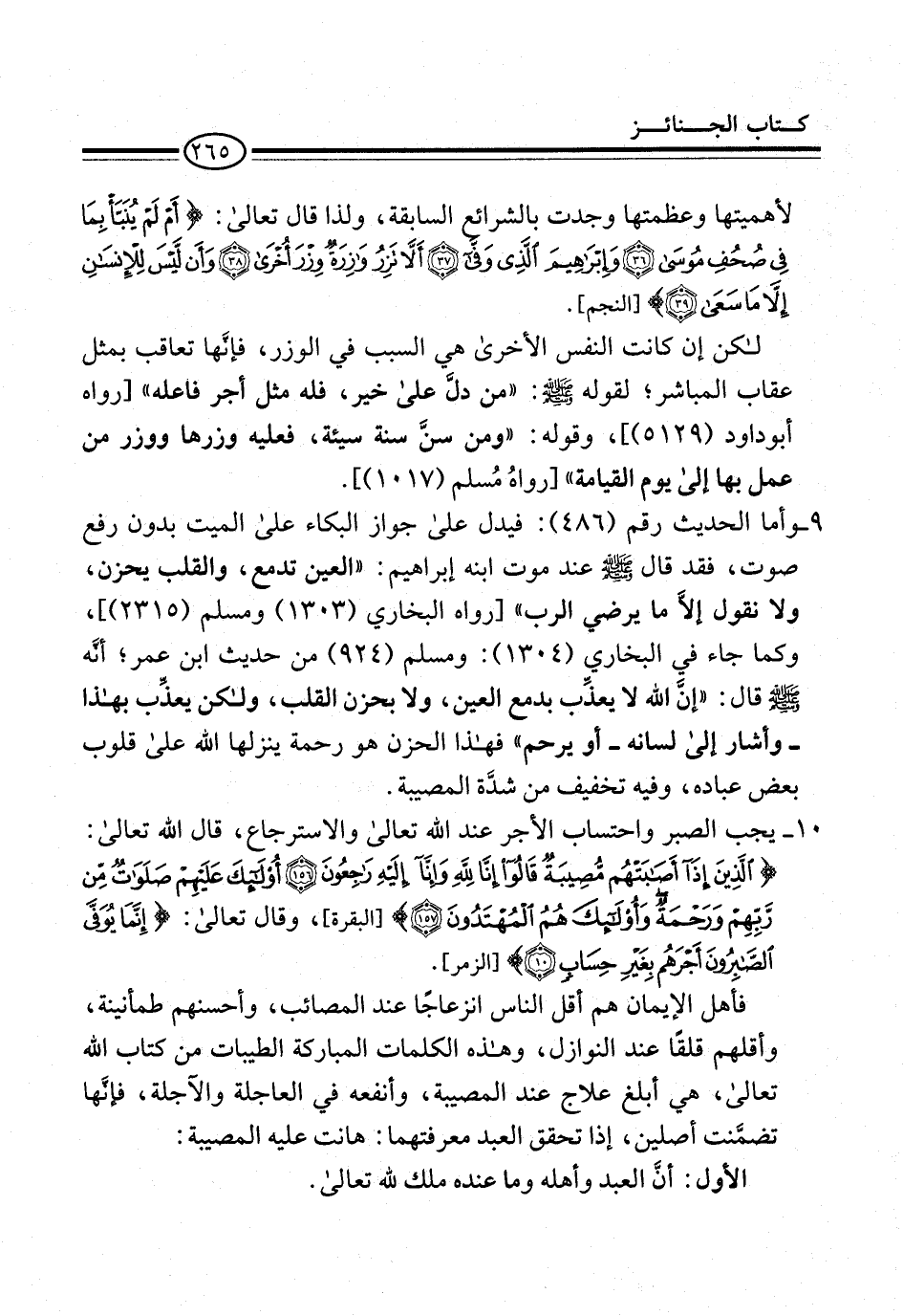 9 - وأما الحديث رقم (486): فيدل على جواز البكاء على الميت بدون رفع صوت، فقد قال -صلى الله عليه وسلم- عند موت ابنه إبراهيم: "العين تدمع، والقلب يحزن، ولا نقول إلاَّ ما يرضي الرب" [رواه البخاري (1303) ومسلم (2315)]، وكما جاء في البخاري (1304): ومسلم (924) من حديث ابن عمر؛ أنَّه -صلى الله عليه وسلم- قال: "إنَّ الله لا يعذِّب بدمع العين، ولا بحزن القلب، ولكن يعذِّب بهذا -وأشار إلى لسانه- أو يرحم" فهذا الحزن هو رحمة ينزلها الله على قلوب بعض عباده، وفيه تخفيف من شدَّة المصيبة.