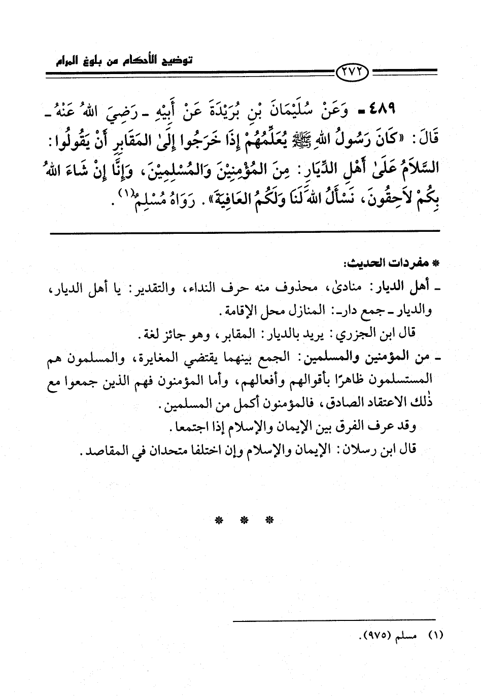 489 - وَعَنْ سُلَيْمَانَ بْنِ بُرَيْدَةَ عَنْ أَبِيْهِ -رَضِيَ اللهُ عَنْهُ- قَالَ: "كانَ رَسُولُ اللهِ -صلى الله عليه وسلم- يُعَلِّمُهُمْ إِذَا خَرَجُوا إِلَى المَقَابِرِ أَنْ يَقُولُوا: السَّلاَمُ عَلَى أهْلِ الدِّيَارِ: مِنَ المُؤْمنِيْنَ وَالمُسْلِمِيْنَ، وَإِنَّا إنْ شَاءَ اللهُ بِكُمْ لاَحِقُونَ، نَسْأَلُ الله لَنَا وَلَكُمُ العَافِيةَ". رَوَاهُ مُسْلِمٌ (¬1).