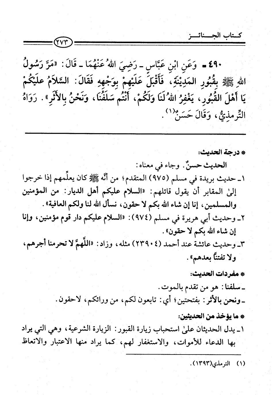 490 - وَعَنِ ابْنِ عَبَّاسٍ -رَضِيَ اللهُ عَنْهُمَا- قَالَ: "مَرَّ رَسُولُ اللهِ -صلى الله عليه وسلم- بِقُبُورِ المَدِيْنةِ، فَأَقْبلَ عَلَيْهِمْ بِوَجْهِهِ فَقَالَ: السَّلاَمُ علَيْكُمْ يَا أهْلَ القُبُورِ، يَغْفِرُ اللهُ لَنا وَلَكُمْ، أنْتُم سَلَفُنَا، وَنَحْنُ بِالأَثَرِ". رَوَاهُ التِّرمذِيُّ، وَقَالَ حَسَنٌ (¬1).