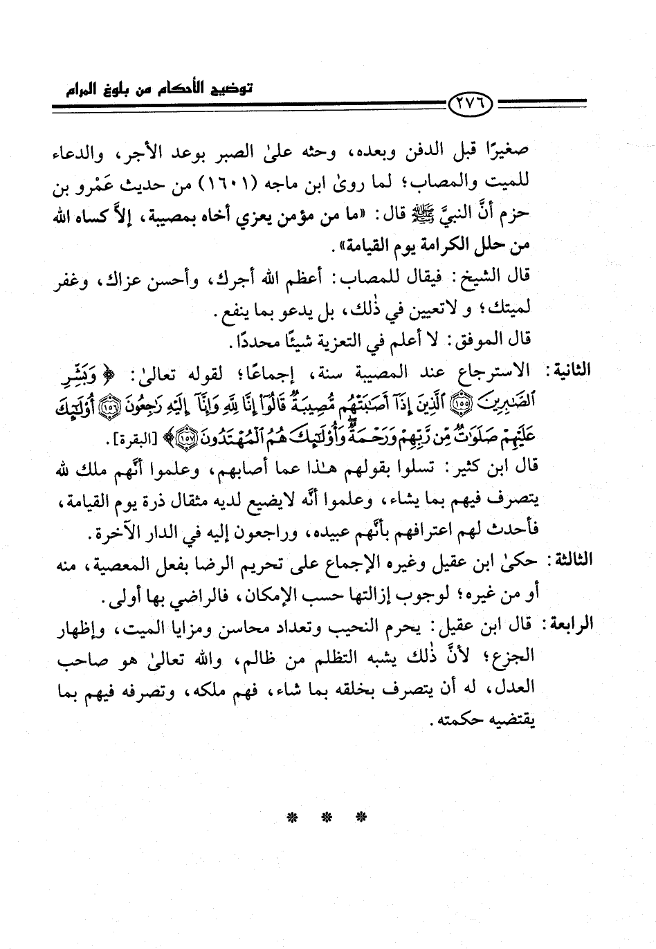 الثانية: الاسترجاع عند المصيبة سنة، إجماعًا؛ لقوله تعالى: {وَبَشِّرِ الصَّابِرِينَ (155) الَّذِينَ إِذَا أَصَابَتْهُمْ مُصِيبَةٌ قَالُوا إِنَّا لِلَّهِ وَإِنَّا إِلَيْهِ رَاجِعُونَ (156) أُولَئِكَ عَلَيْهِمْ صَلَوَاتٌ مِنْ رَبِّهِمْ وَرَحْمَةٌ وَأُولَئِكَ هُمُ الْمُهْتَدُونَ (157)} [البقرة].