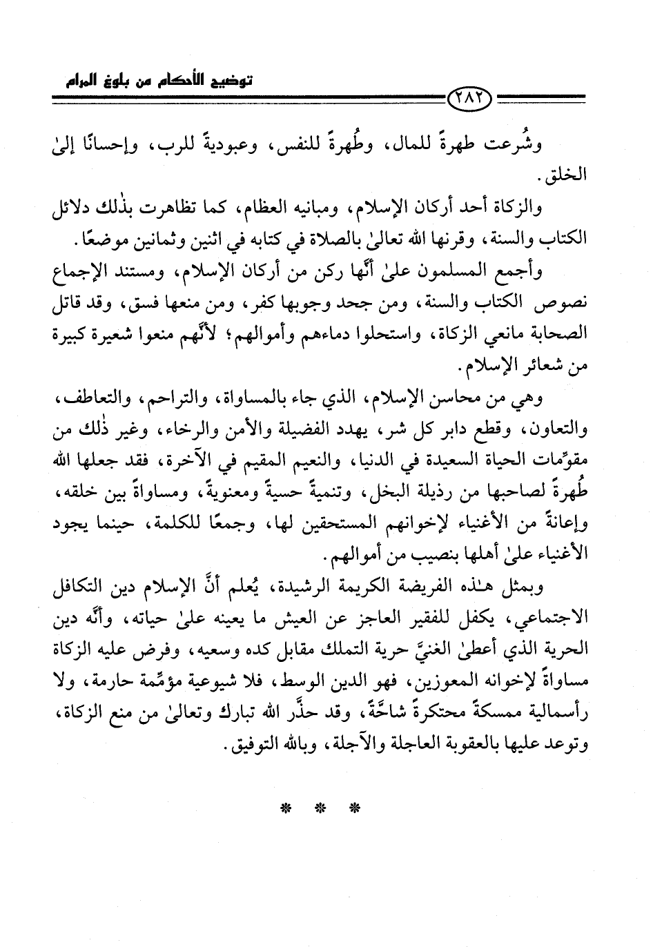 وبمثل هذه الفريضة الكريمة الرشيدة، يُعلم أنَّ الإسلام دين التكافل الاجتماعي، يكفل للفقير العاجز عن العيش ما يعينه على حياته، وأنَّه دين الحرية الذي أعطى الغنيَّ حرية التملك مقابل كده وسعيه، وفرض عليه الزكاة مساواةً لإخوانه المعوزين، فهو الدين الوسط، فلا شيوعية مؤمِّمة حارمة، ولا رأسمالية ممسكةً محتكرةً شاحَّةً، وقد حذَّر الله تبارك وتعالى من منع الزكاة، وتوعد عليها بالعقوبة العاجلة والآجلة، وبالله التوفيق.