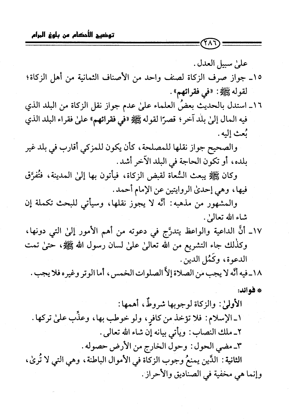 16 - استدل بالحديث بعضُ العلماء على عدم جواز نقل الزكاة من البلد الذي فيه المال إلى بدلد آخر؛ قصرًا لقوله -صلى الله عليه وسلم- "في فقرائهم" على فقراء البلد الذي بُعث إليه.